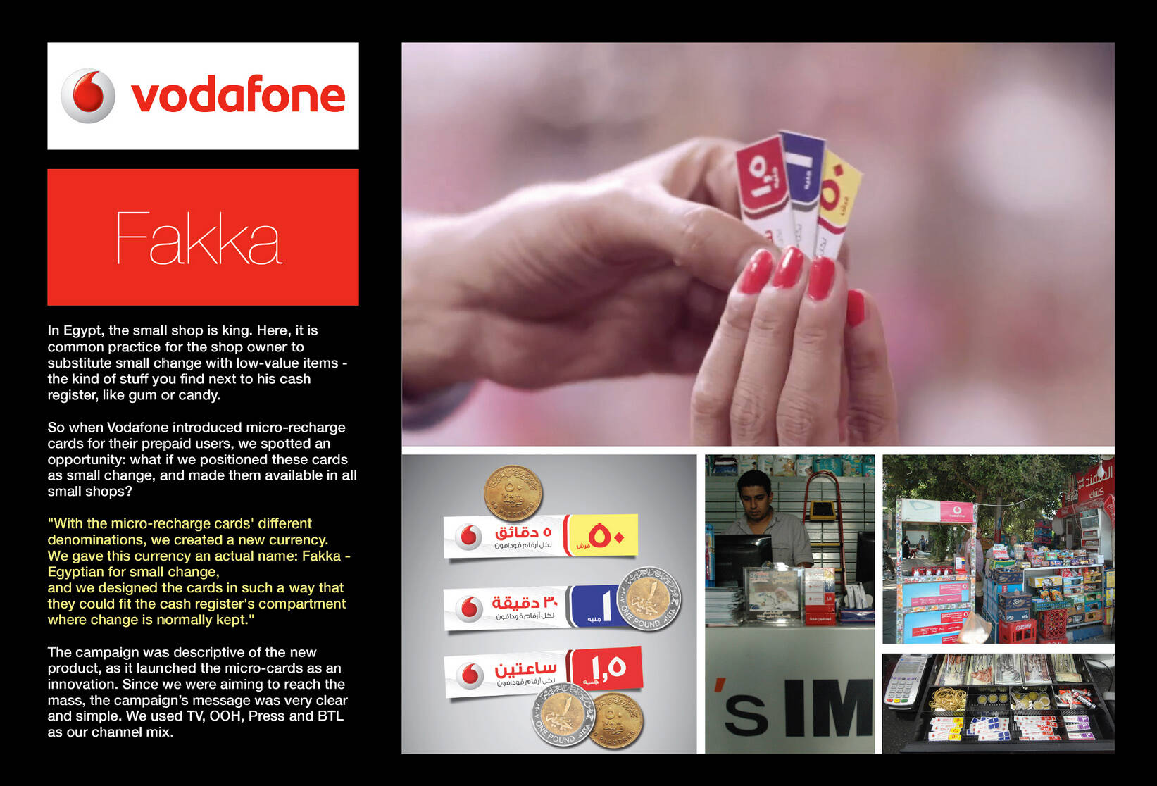 This professional campaign titled 'Micro Recharge Cards' was published in Egypt in June, 2013. It was created for the brand: Vodafone, by ad agency: JWT. This Static Images medium campaign is related to the Electronics, Technology industry and contains 1 media asset. It was submitted over 12 years ago.