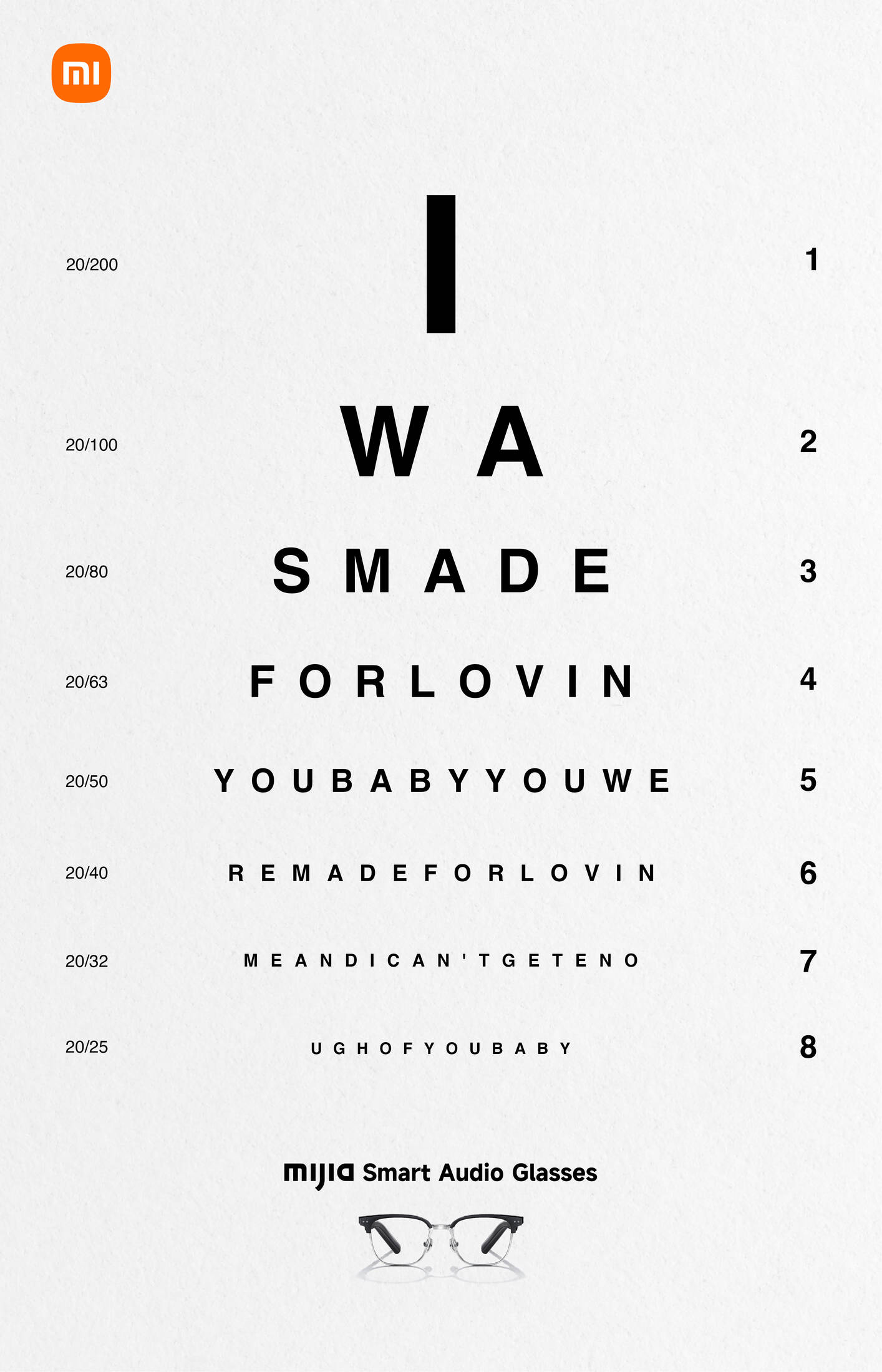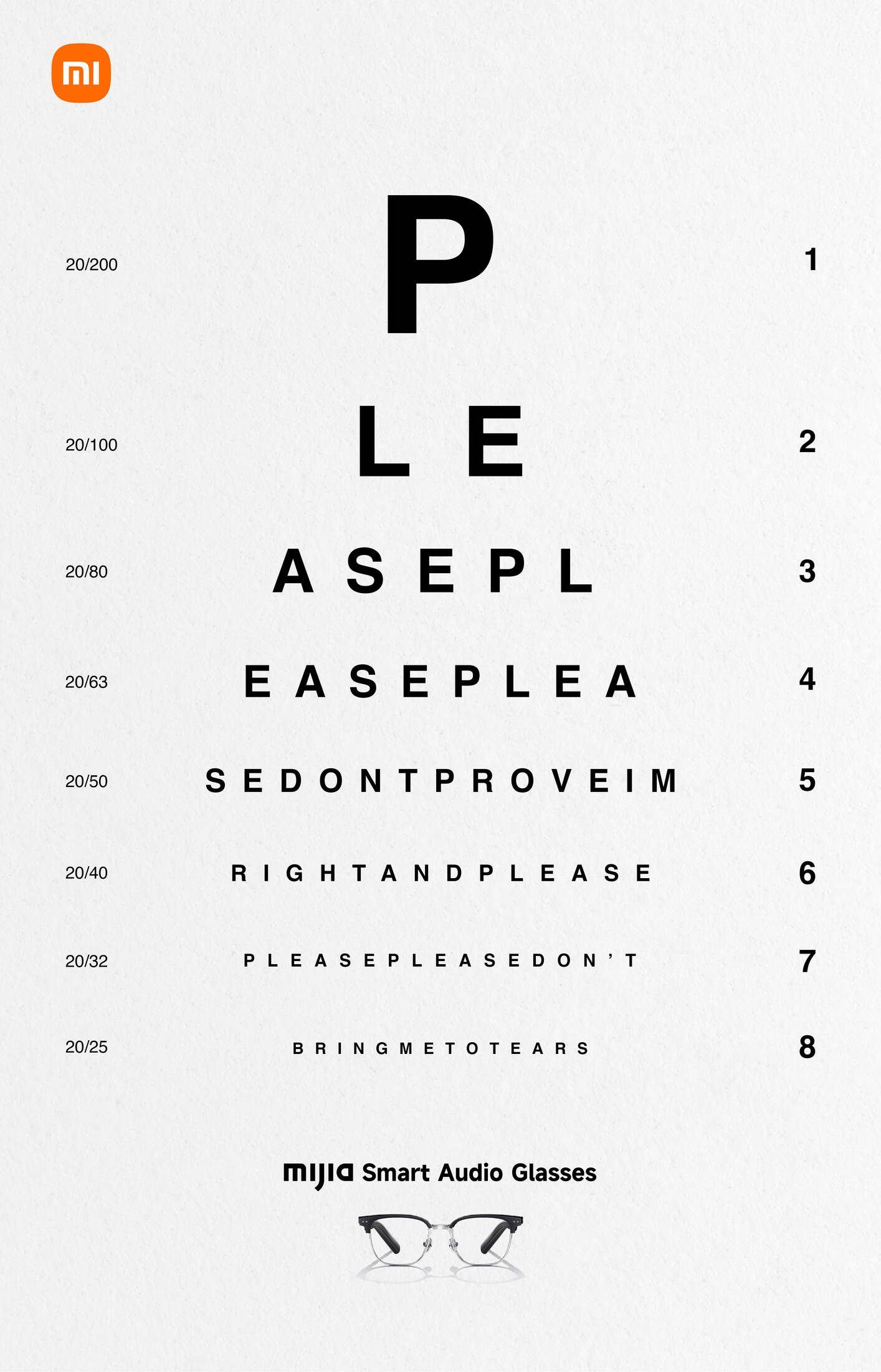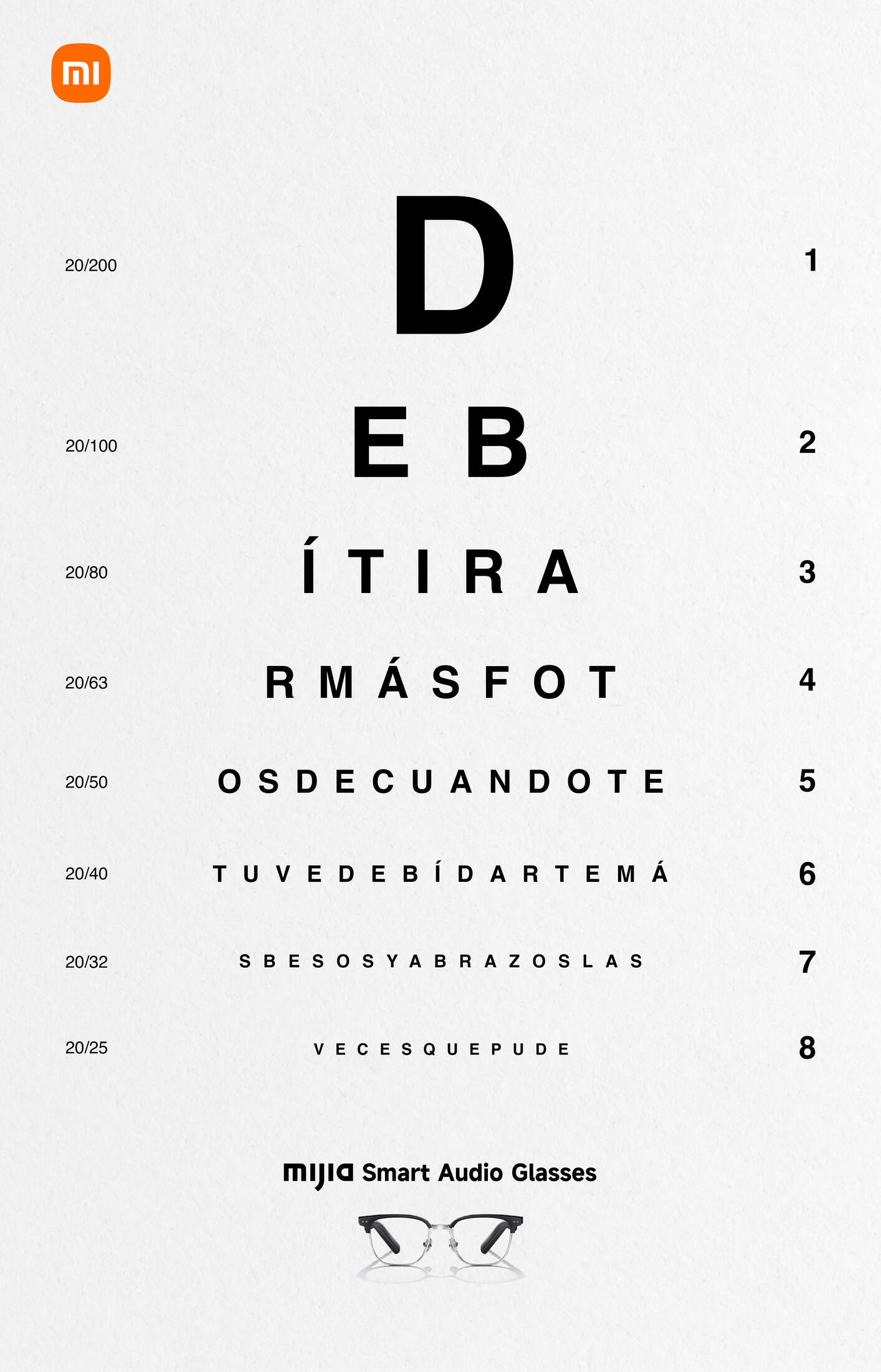 The campaign reinterprets the classic eye chart as a metaphor that communicates the product’s main benefit: glasses through which you can listen to music. As the lines descend and become smaller, the viewer discovers fragments of recognizable lyrics —“Debí tirar más fotos,” “I Was Made for Lovin’ You,” and “Please Please Please”— that can only be perceived through close attention. With a minimal composition, black typography on a white background, and the subtle presence of Xiaomi’s Mijia Smart Audio Glasses.