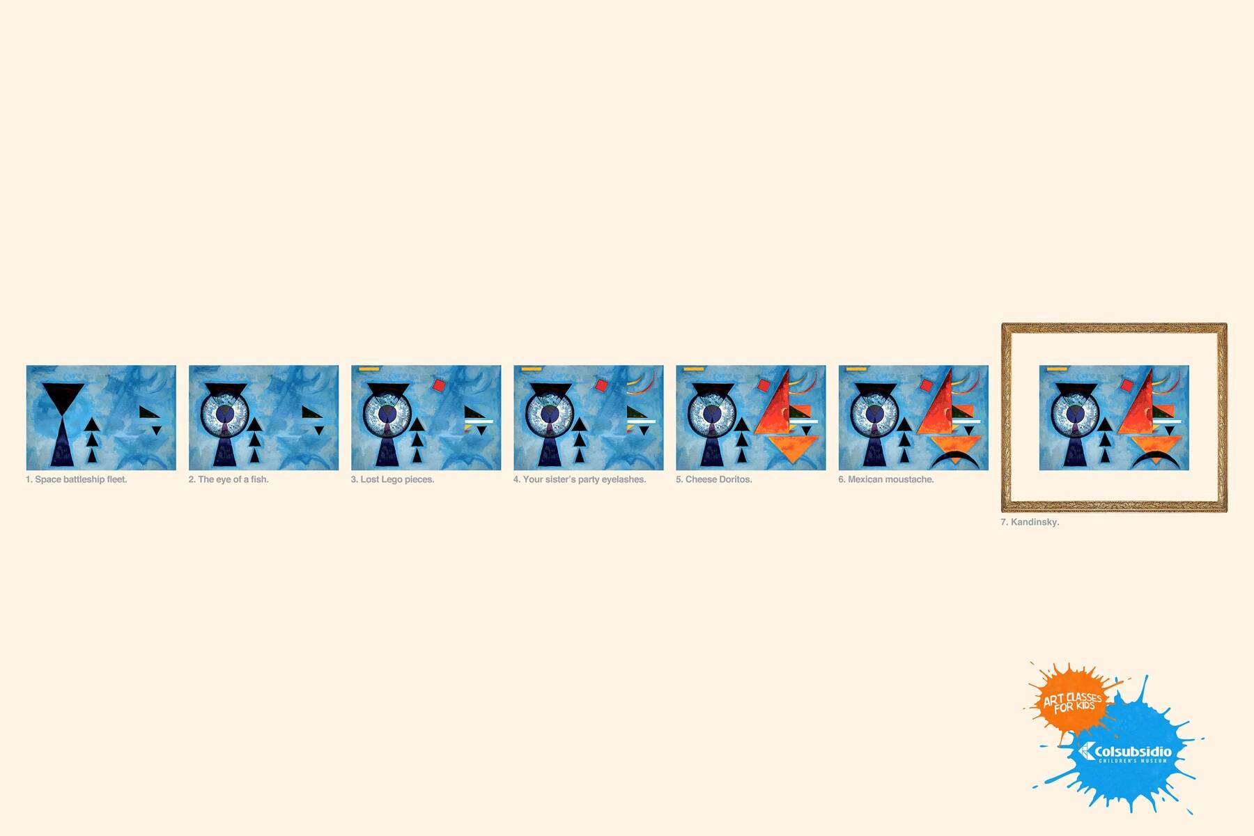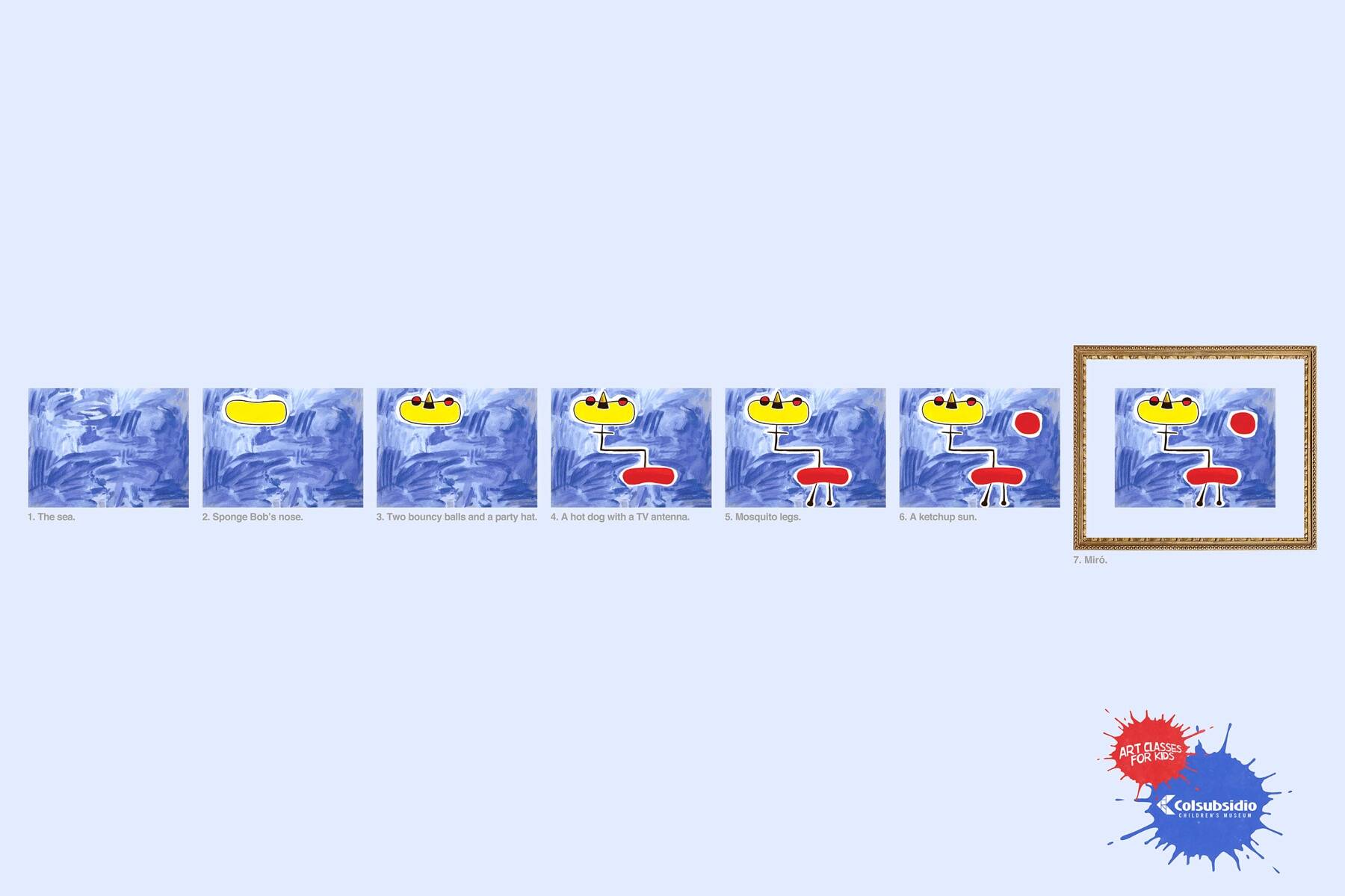 This professional campaign titled 'Mirò, Kandinsky, Picasso' was published in Colombia in June, 2013. It was created for the brand: Colsubsidio, by ad agency: Lowe. This Print medium campaign is related to the Education industry and contains 3 media assets. It was submitted over 12 years ago.