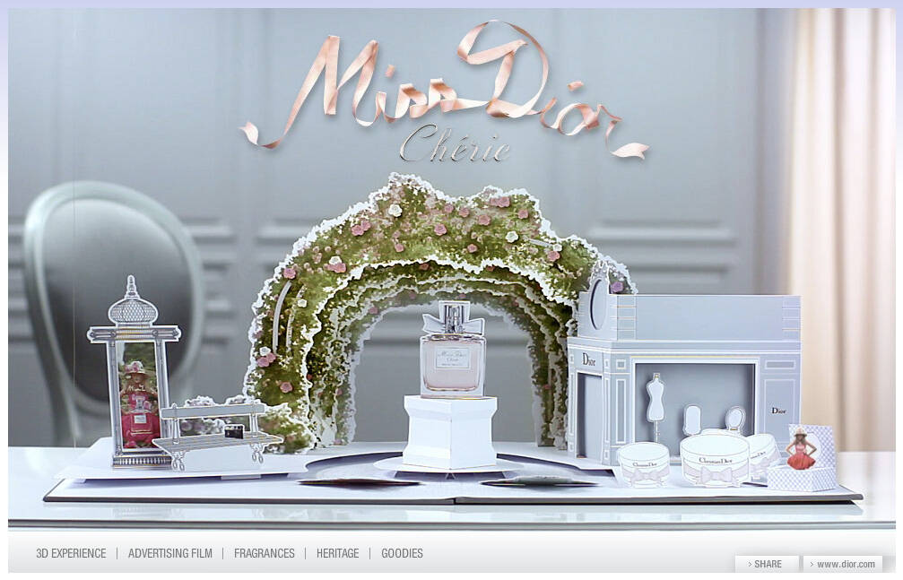 This is the website of Miss Dior Cherie, the new star franchise of the Dior perfum portfolio. You can see the TV and magazine ads on the website too.