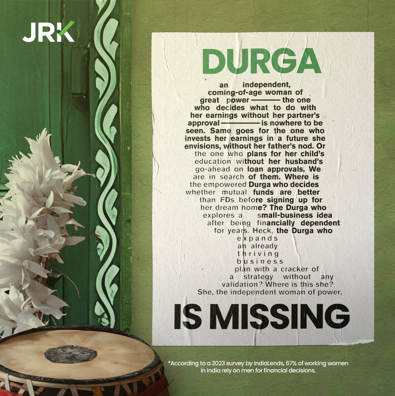 This dependence diminishes the "Durga" within them, leaving their power unclaimed. To raise awareness of this imbalance, JRK has adopted the theme "Durga Is Missing." Using the format of a missing poster, this campaign aims to evoke a sense of absence, highlighting the loss of power when women do not have control over their financial decisions.