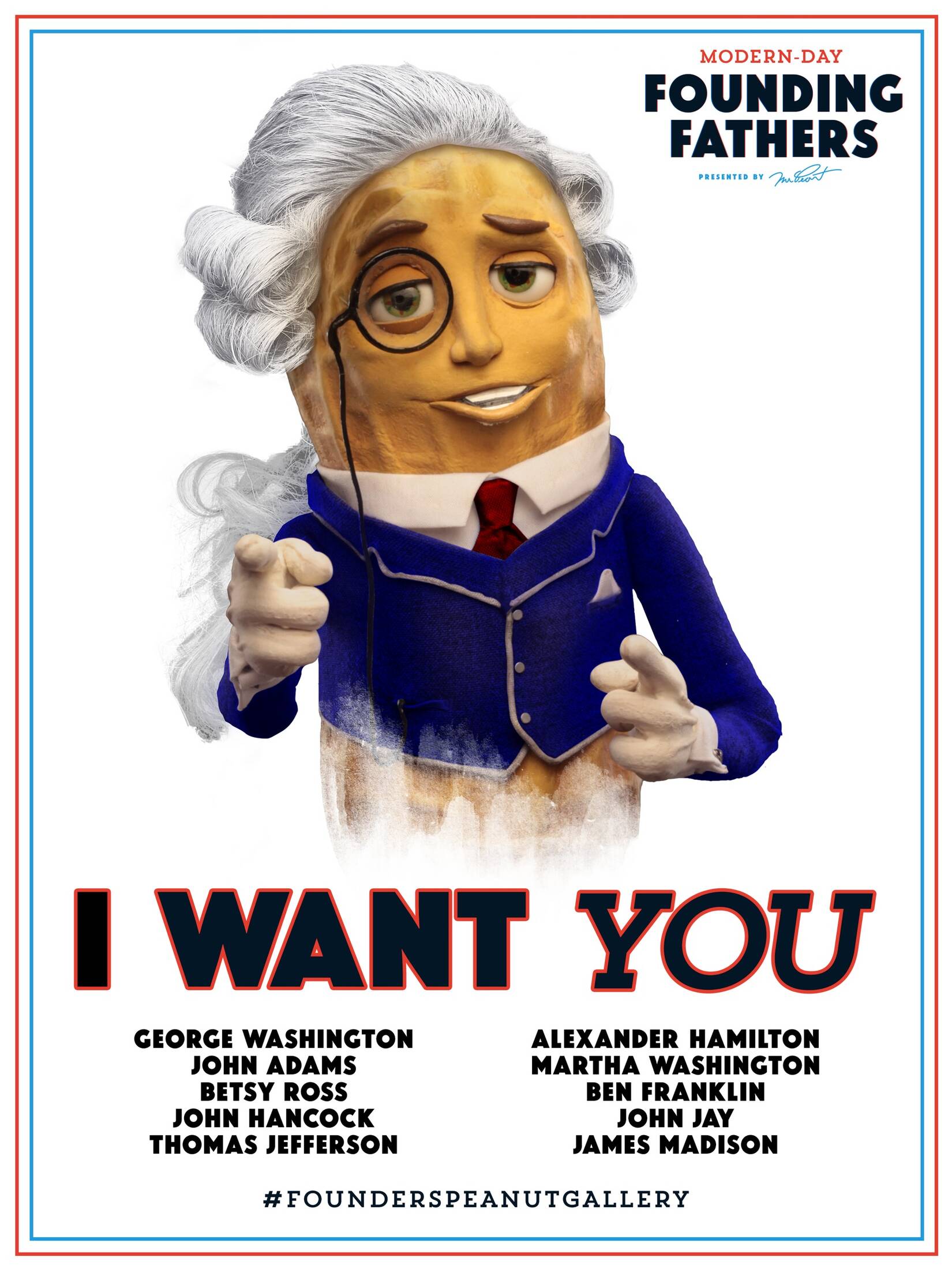 Planters peanuts are grown, harvested and packaged in America. So this 4th of July, Mr. Peanut is celebrating the founding fathers who made America by finding and rewarding their modern day counterparts. Mr. Peanut is thanking the first 50 George Washingtons, John Adams, John Hancocks, Ben Franklins, Tommy Jefferson, John Jays, Jimmy Madisons and Alex Hamiltons of today with a free can of Planters Peanuts and a Presidential wig so they can eat American and wear it too on our nation's birthday.
