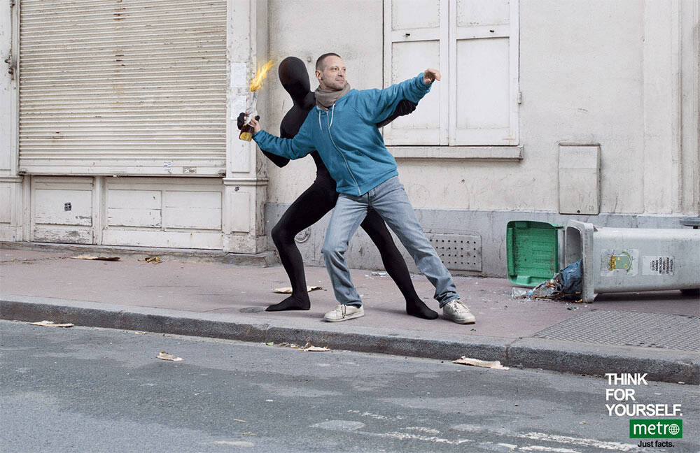 This professional campaign titled 'Molotov cocktail, Vote, Homeless, Pray, Spray, Fan' was published on March 01, 2008. It was created for the brand: Metro, by ad agency: BBDO. This Print medium campaign is related to the Media industry and contains 6 media assets. It was submitted over 17 years ago.