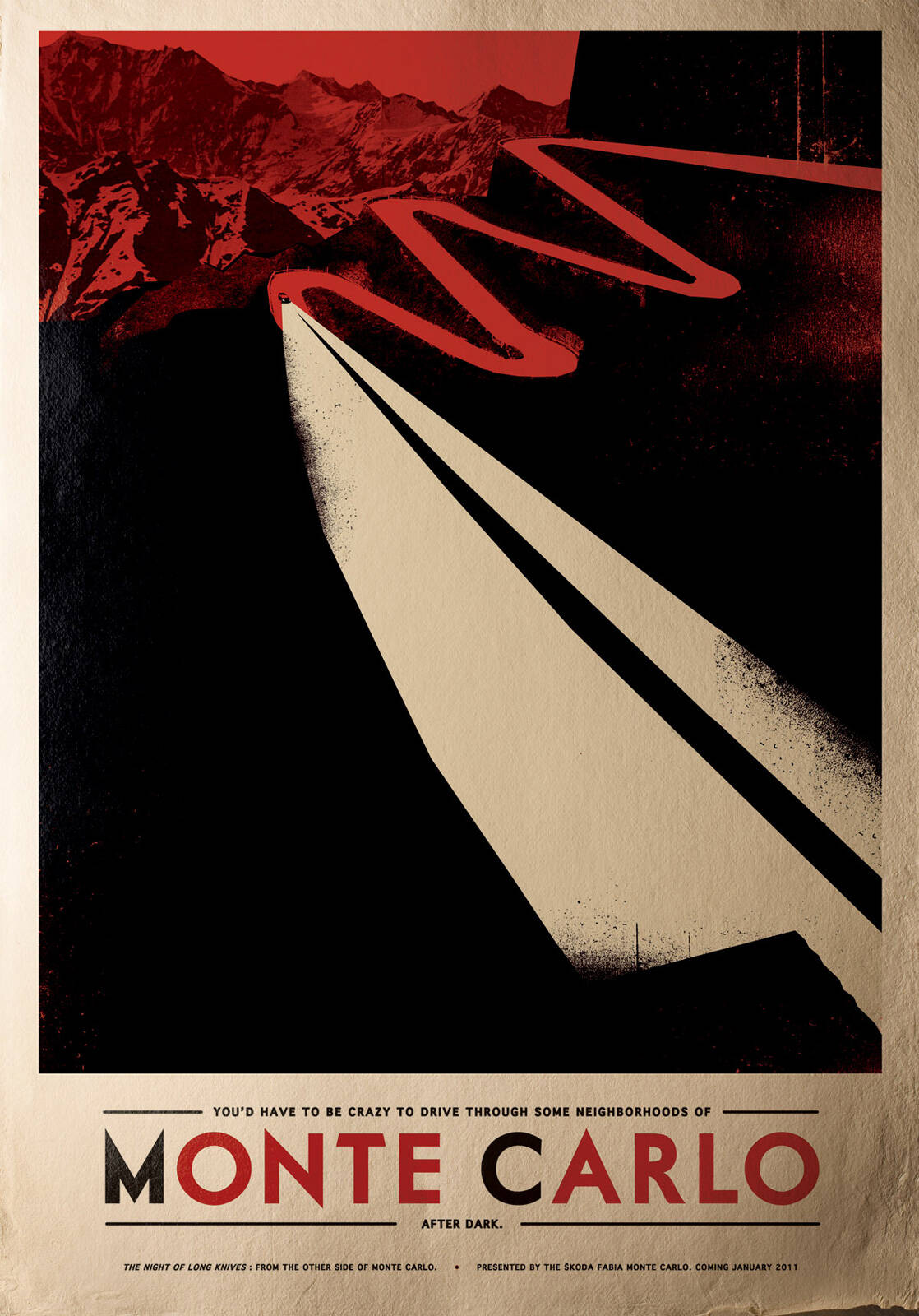 An international teaser poster campaign developed for dealers to use ahead of the 2011 Rallye Monte Carlo in order to create interest for the upcoming Special Edition Fabia Monte Carlo. The posters were also designed to act as giveaways during IRC events in which Skoda was participating.