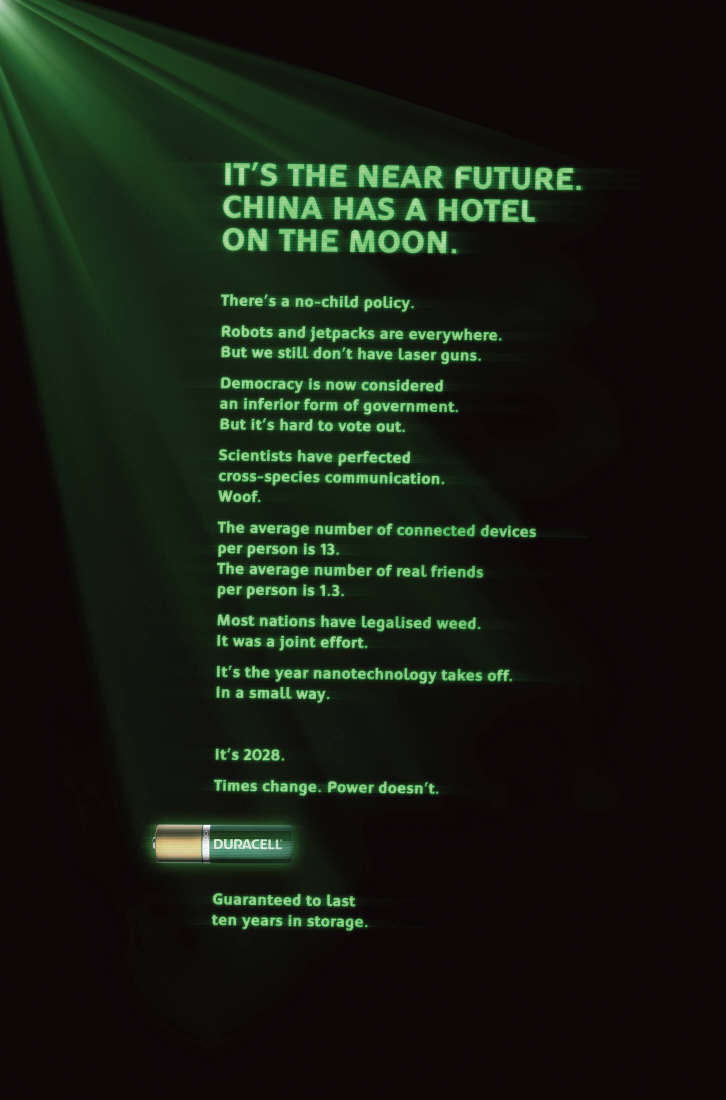 Going back was only the beginning. In this sequel to last year’s Times Change campaign, we’re heading to the future. By predicating the possibilities of the year 2028, we highlight the ten-year duration of our product. This fun, quirky peek at trends and events to come in politics, popular culture, the environment and technology emphasises how much life can change. But the one thing you can rely on is a Duracell battery.