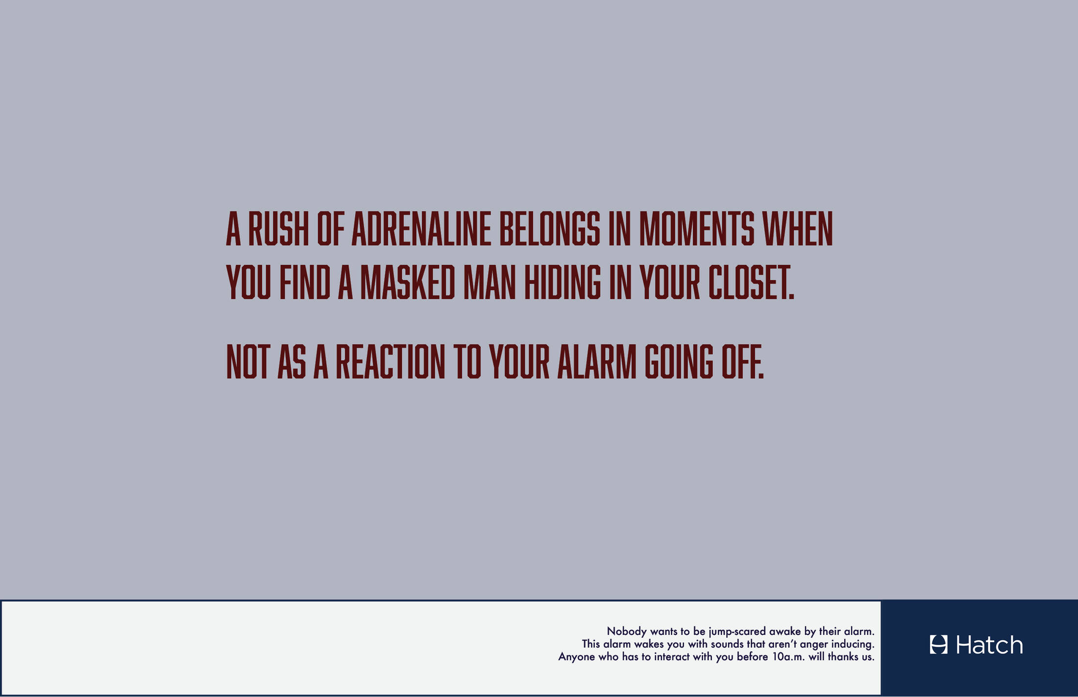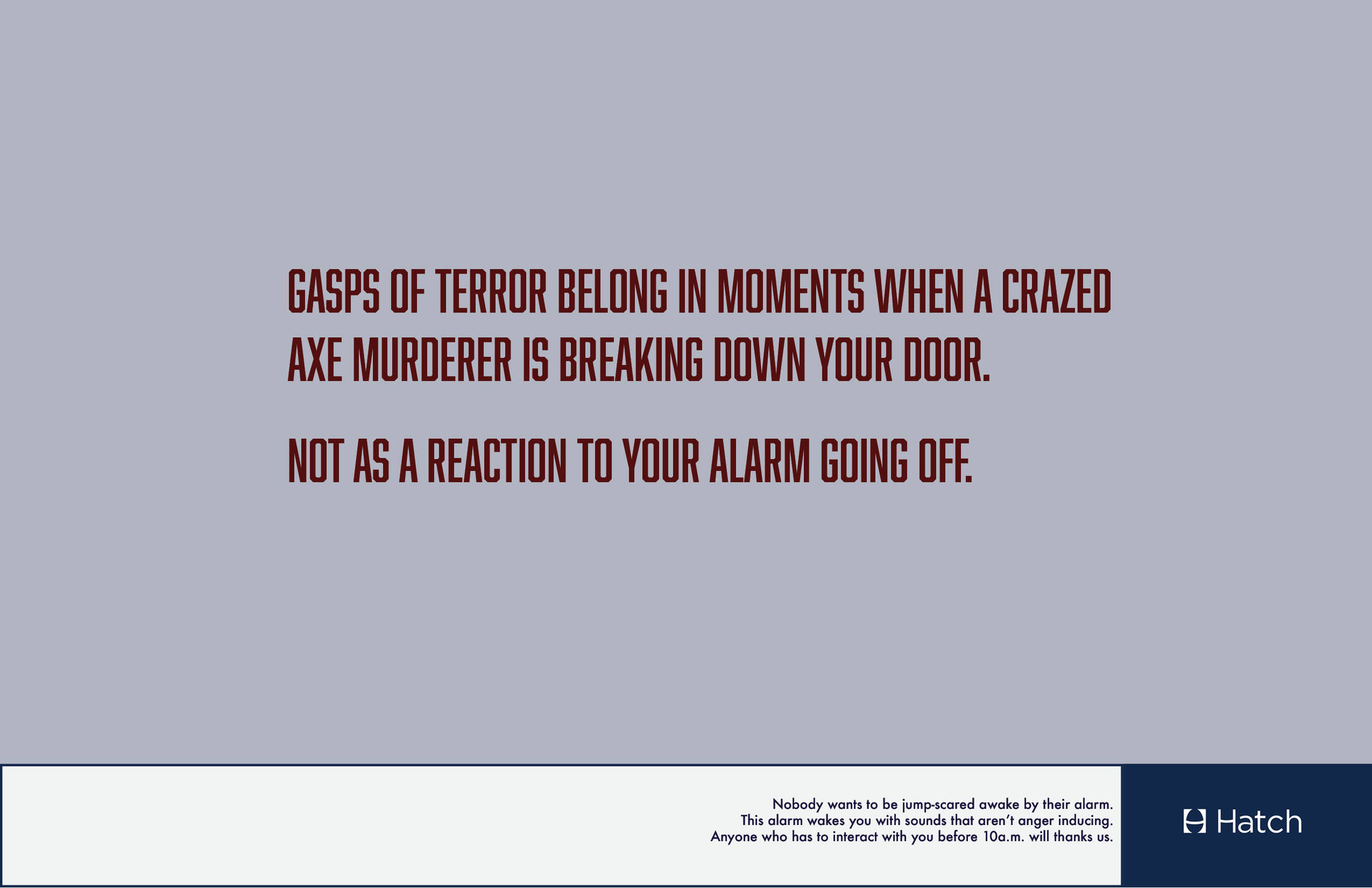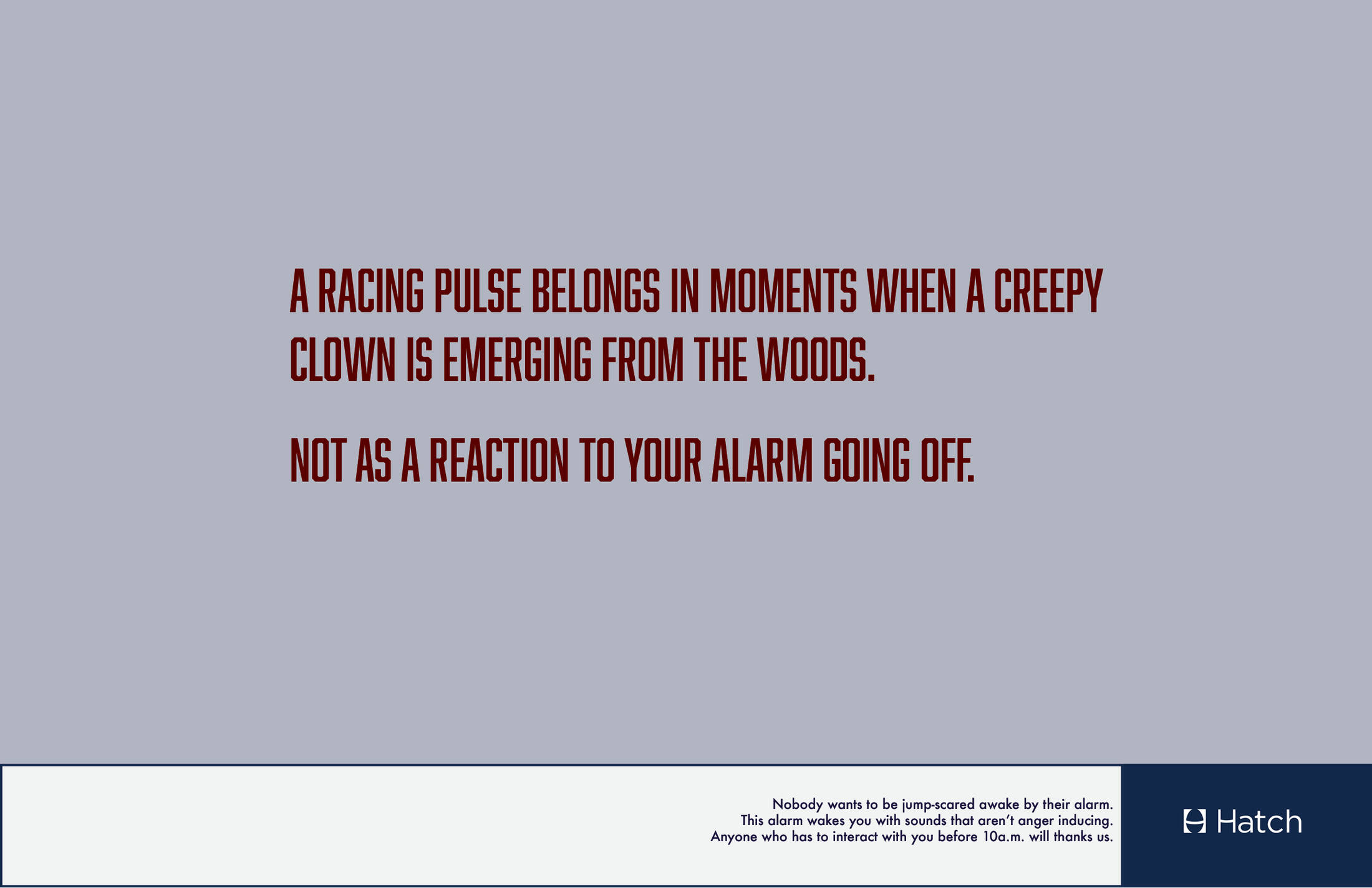 Execution: Pairs horror-movie tropes with exaggerated alarm reactions to show how traditional alarms feel shocking and positions Hatch as the calm way to wake up.