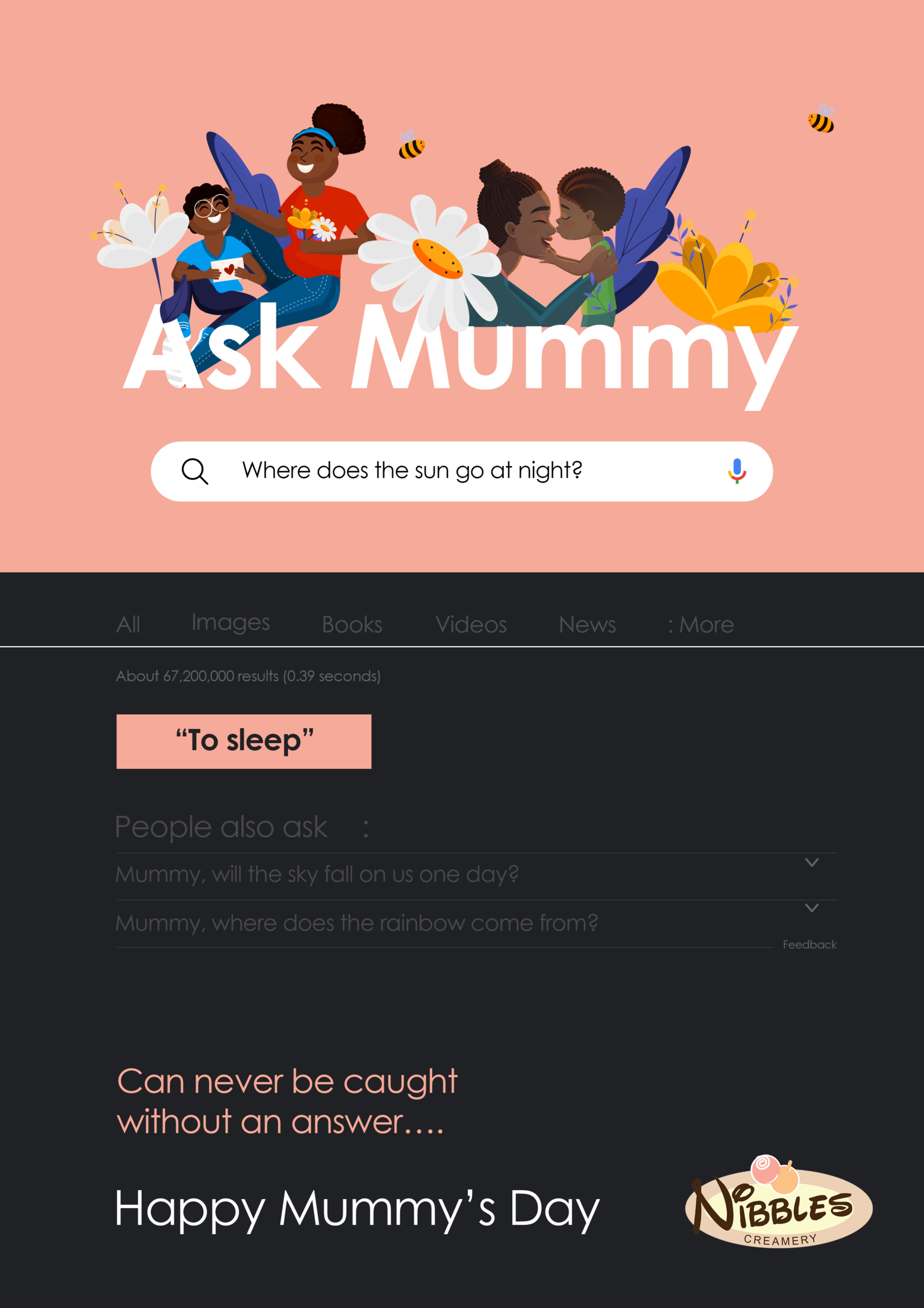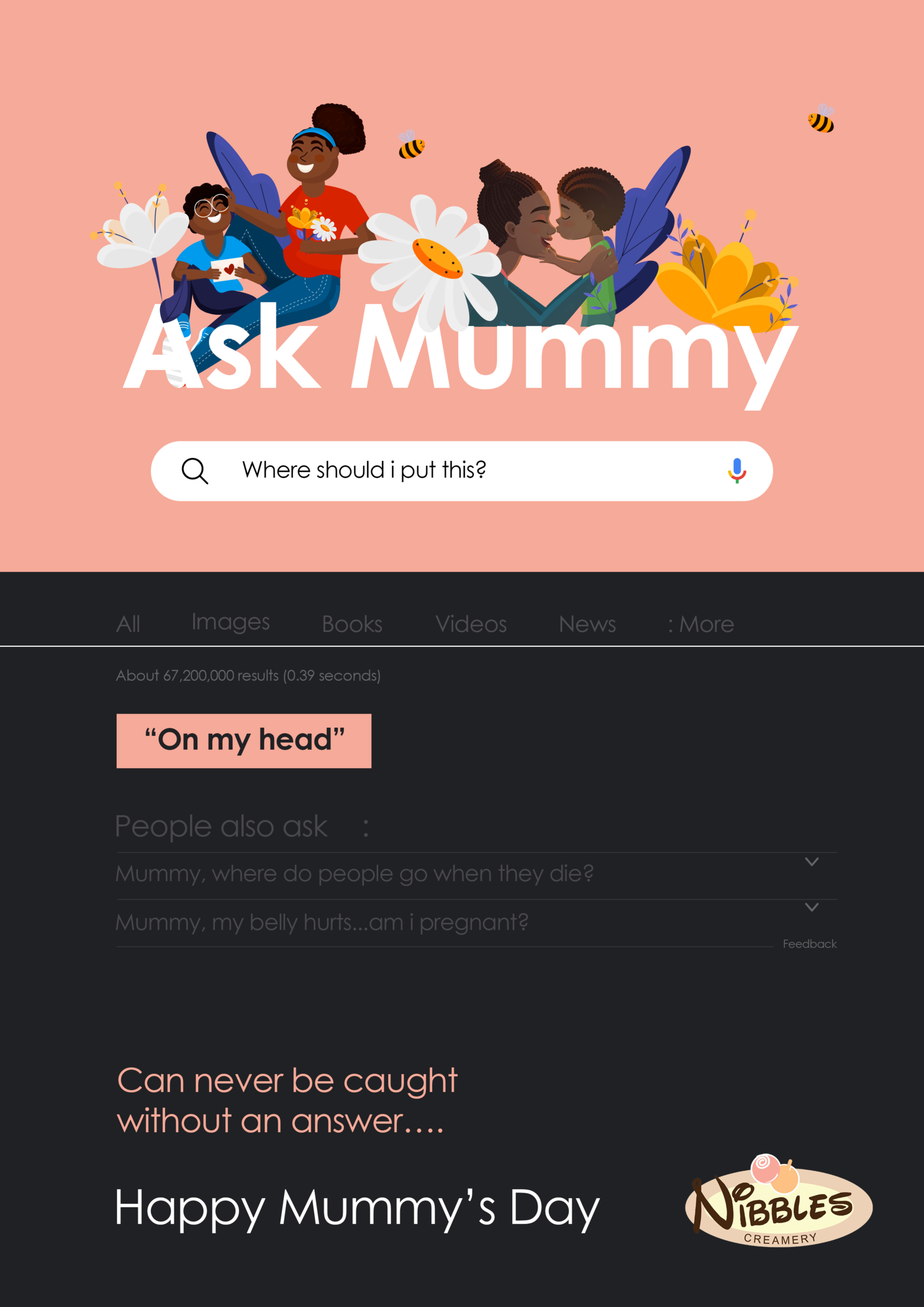 This professional campaign titled 'Mother's Day: Ask Mummy' was published in Nigeria in March, 2023. It was created for the brand: Nibbles Creamery, by ad agency: Onewildcard. This Digital and Print media campaign is related to the Confectionery, Snacks and Food industries and contains 2 media assets. It was submitted over 2 years ago.
