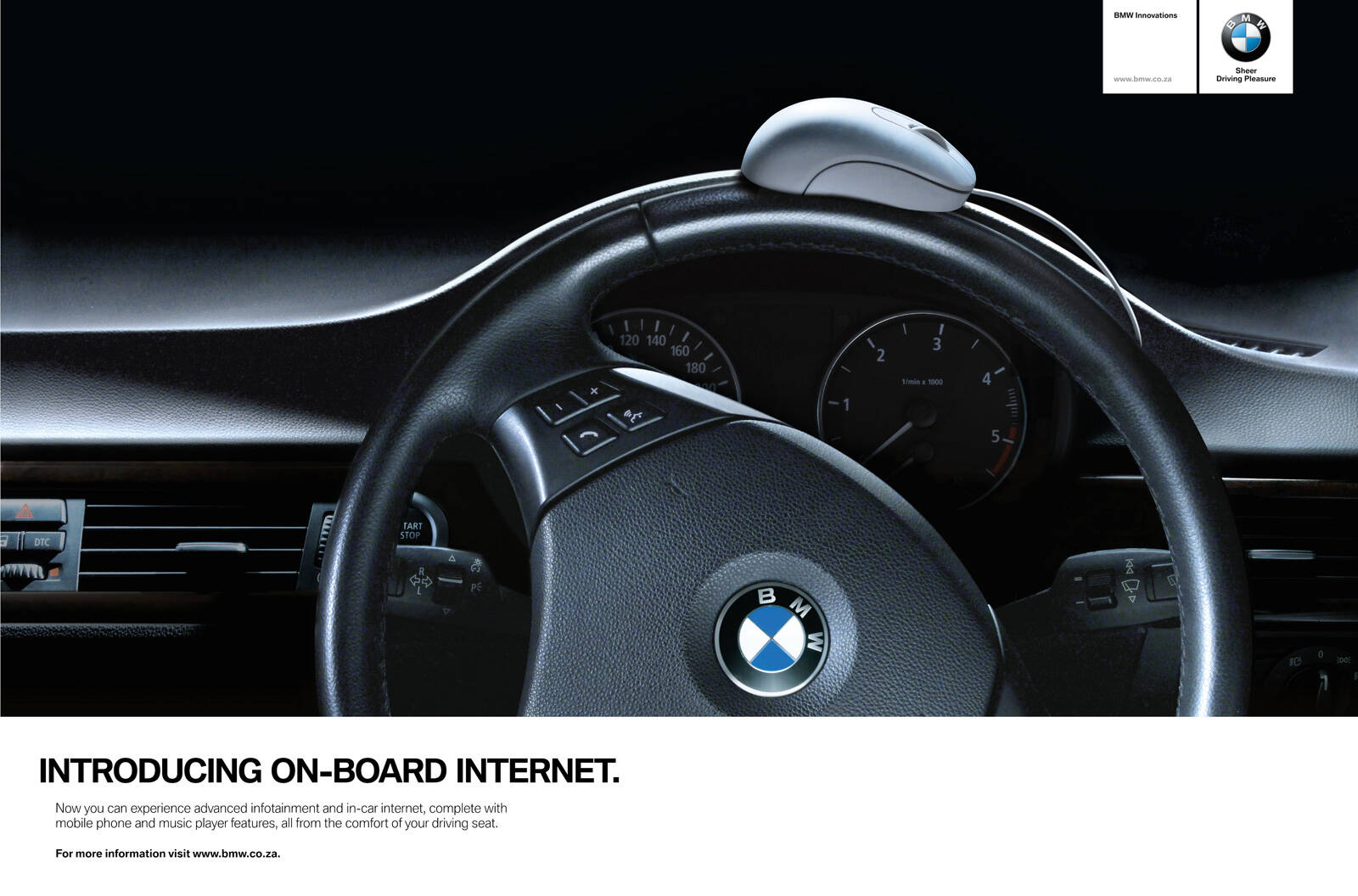This print ad was run in press in November in South Africa. It is an adaptation of the iconic South African “BMW Mouse” TV commercial originally created for power steering. The concept revolves around linking past innovations with present ones (on-board internet) by replacing the live mouse with a digital version. See link of original: http://www.youtube.com/watch?v=Qf0jvHfTODw