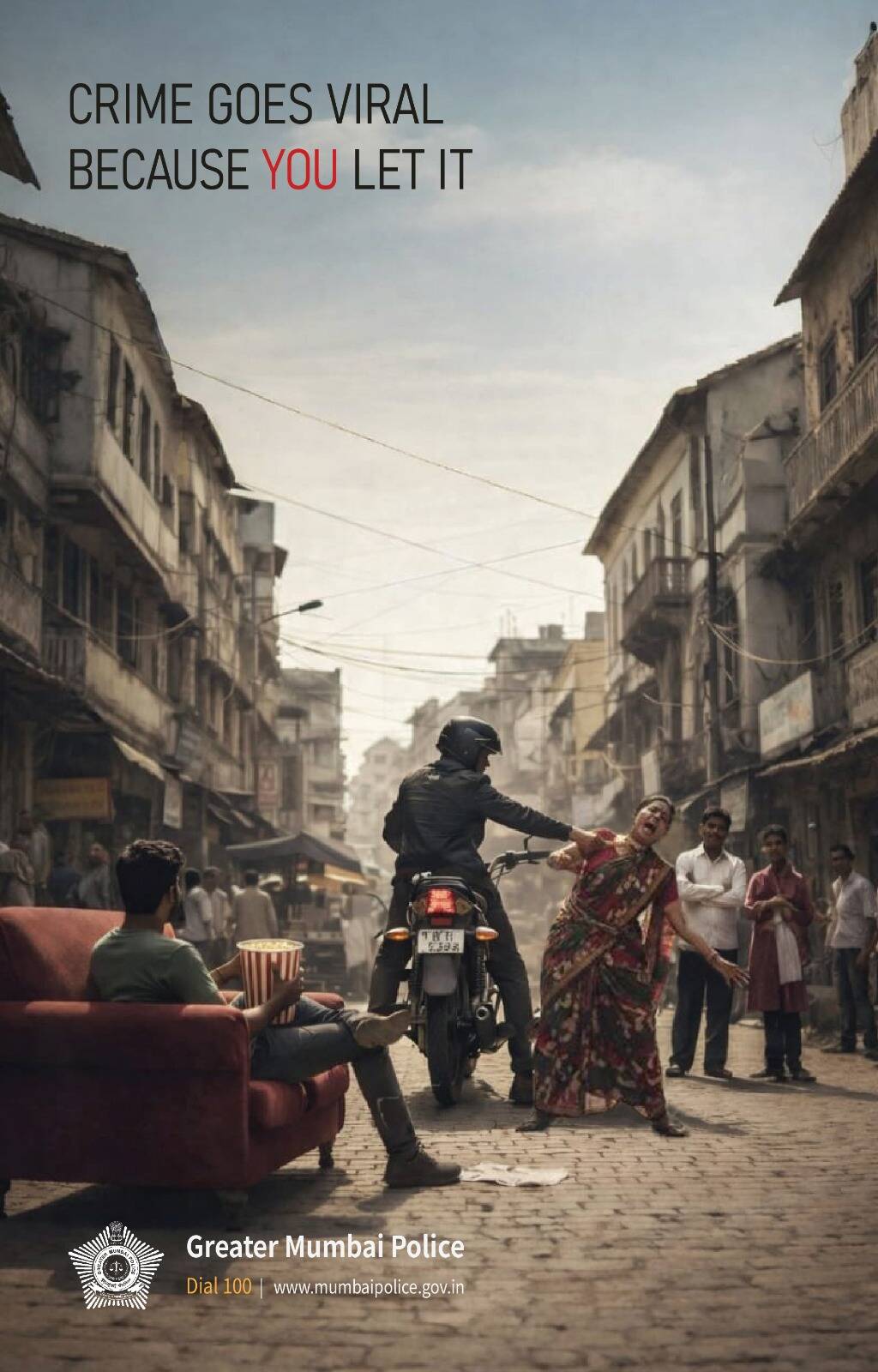 This student print campaign highlights society’s passive role in enabling crime. Each visual depicts serious crimes unfolding in public while bystanders behave as if they are watching entertainment- sitting casually, eating snacks, or observing without action.