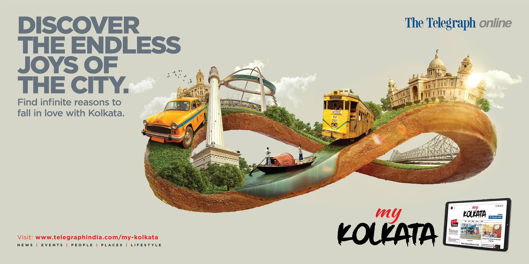 This campaign has been created to celebrate the love for the 'City of Joy - Kolkata', in the state of West Bengal in India. The people of the city and even non-resident Kolkatans feel infinite love for their beloved city, which they cherish. This is creatively represented through an infinity symbol using the various landmarks and props that represent the unique culture and character of the city. These outdoors were created to promote the My Kolkata section of a popular online newspaper called the Telegraph Online, as it informs readers on all city centric news, so they can constantly stay connected and be aware of what's trending in their city.