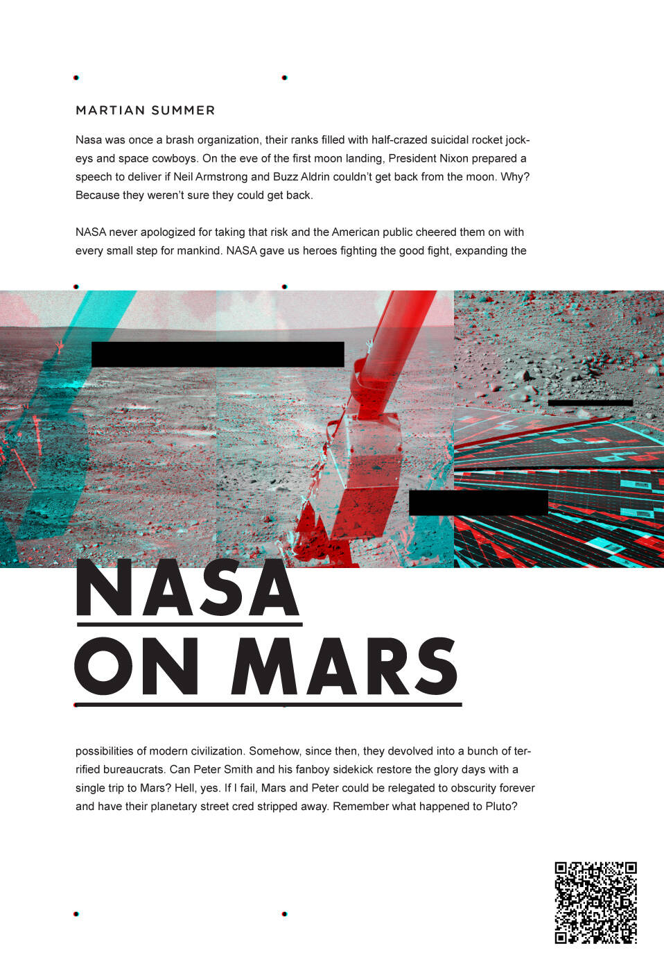 This professional campaign titled 'Nasa on Mars, Conspiracy, The future of Mars, O Captain!,...' was published in United States in March, 2011. It was created for the brand: Martian Summer, by ad agency: Huge. This OOH Outdoor medium campaign is related to the Media industry and contains 6 media assets. It was submitted over 14 years ago.