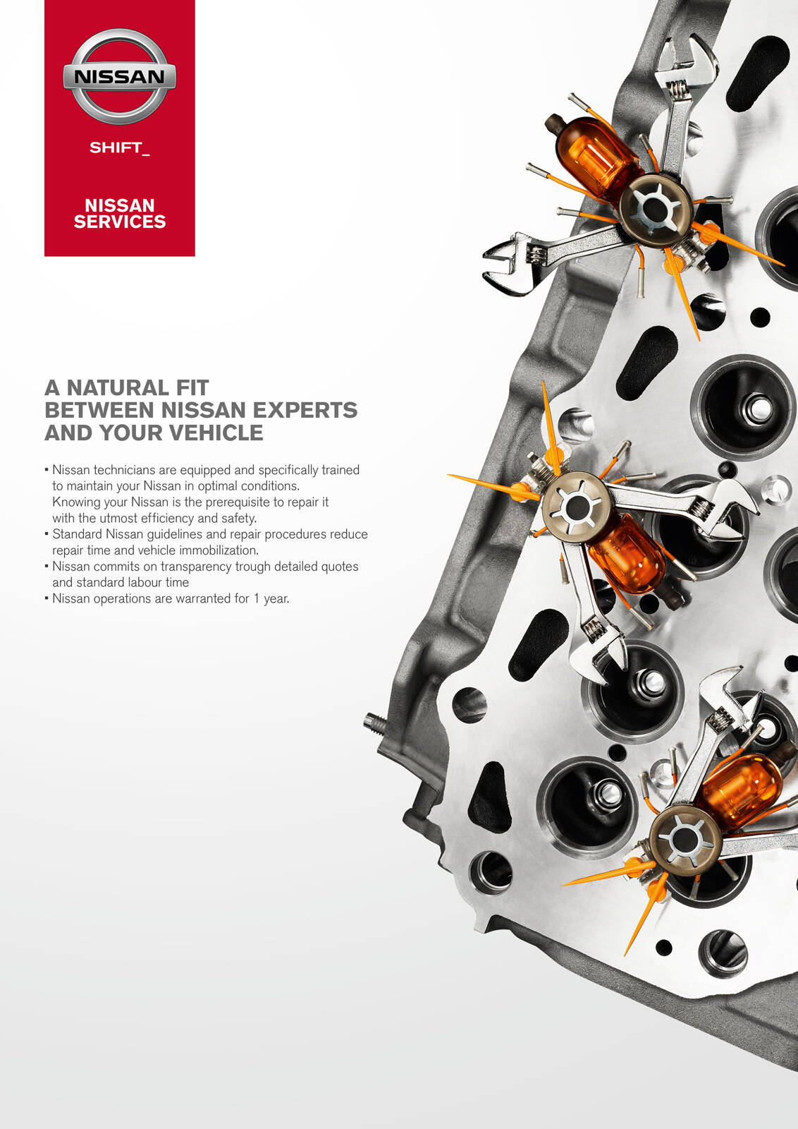 In collaboration with the Creative Sweatshop studio, they made animals entirely composed of Nissan vehicle's spare parts. In order to feature the customer service as the most natural way to maintain Nissan vehicles, the sculptures were created without any 3D or any pieces distortion. The sculptures were shot by Fabrice Fouillet.