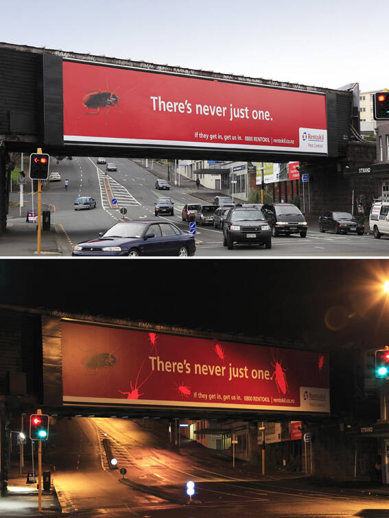 Using special reflective inks illuminated by street and car headlights Republik Auckland illustrated that where there's one roach, there will be others lurking somewhere in the darkness.