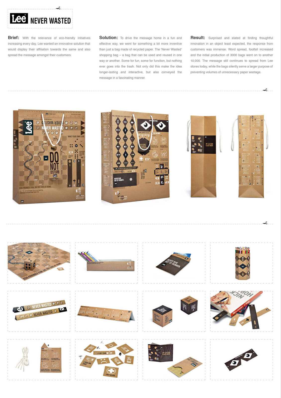 With the relevance of eco-friendly initiatives increasing every day, Lee wanted an innovative solution that would display their affiliation towards the same and also spread the message amongst their customers. To drive the message home in a fun and effective way, we went for something a bit more inventive than just a bag made of recycled paper. The ‘Never Wasted’ shopping bag that can be reused in one way or another. Some for fun, some for function, but nothing ever goes into the trash. Not only did this make the idea long-lasting and interactive but also conveyed the message in a fascinating manner. A surge in interest from patrons forced us to produce 100 times more bags than the initial production of 3,000 bags.