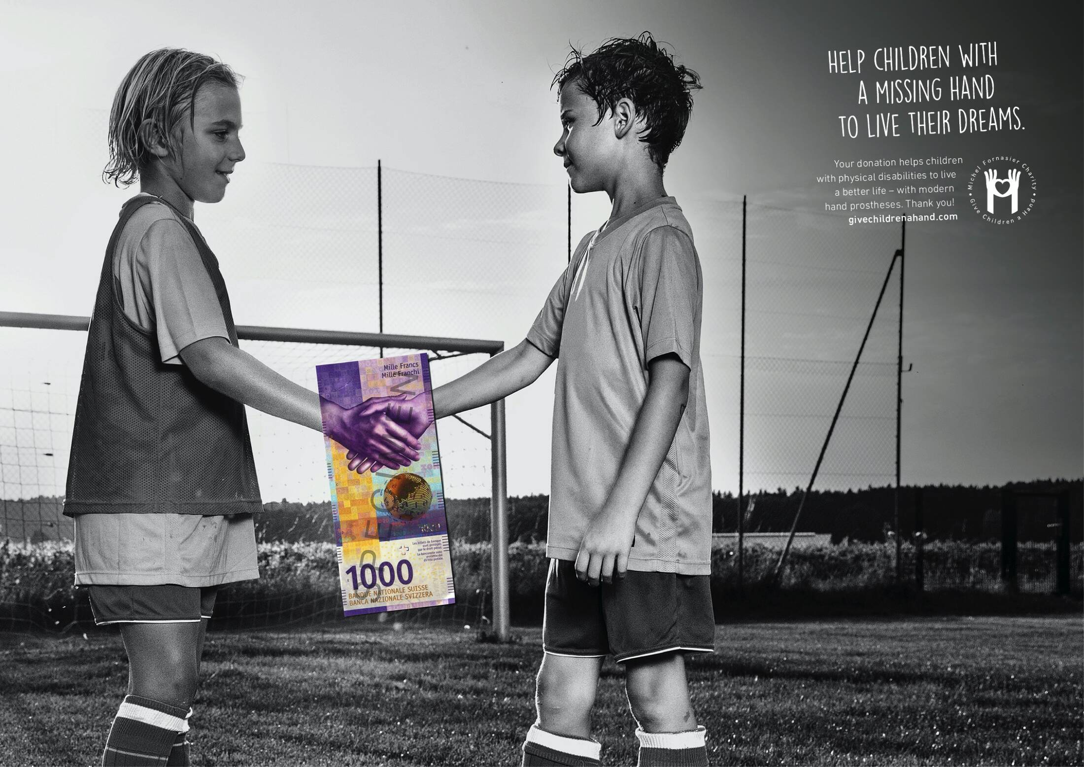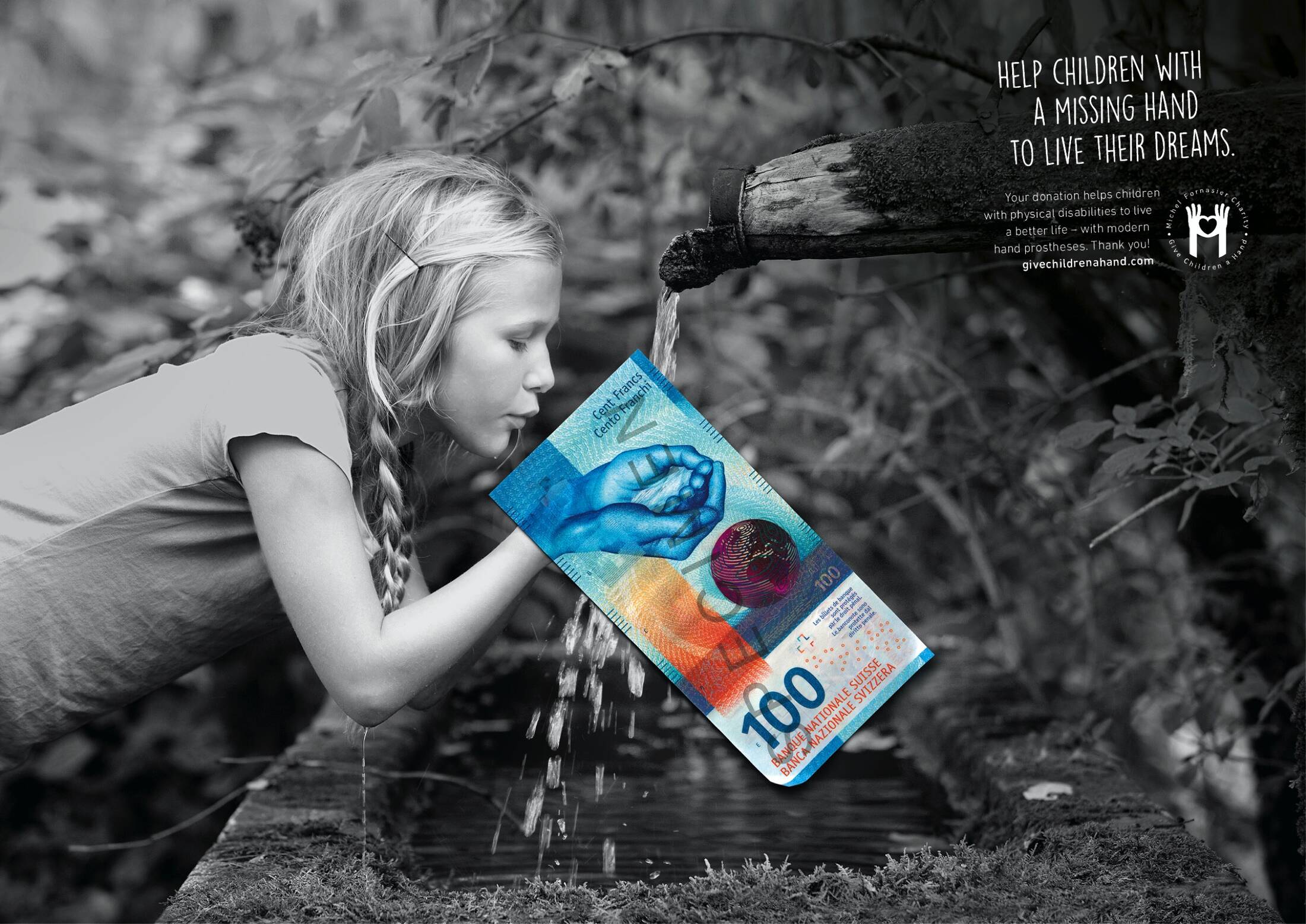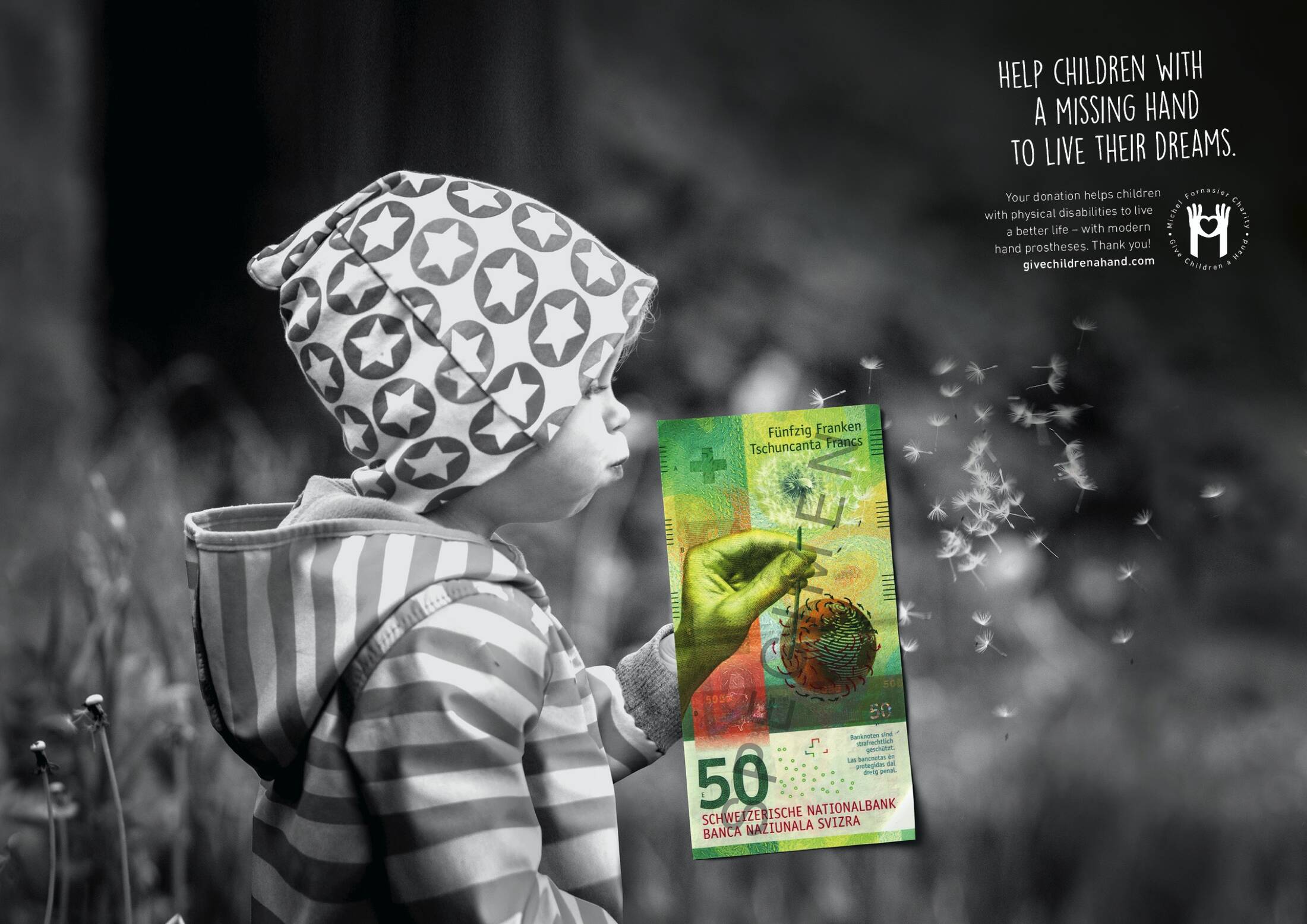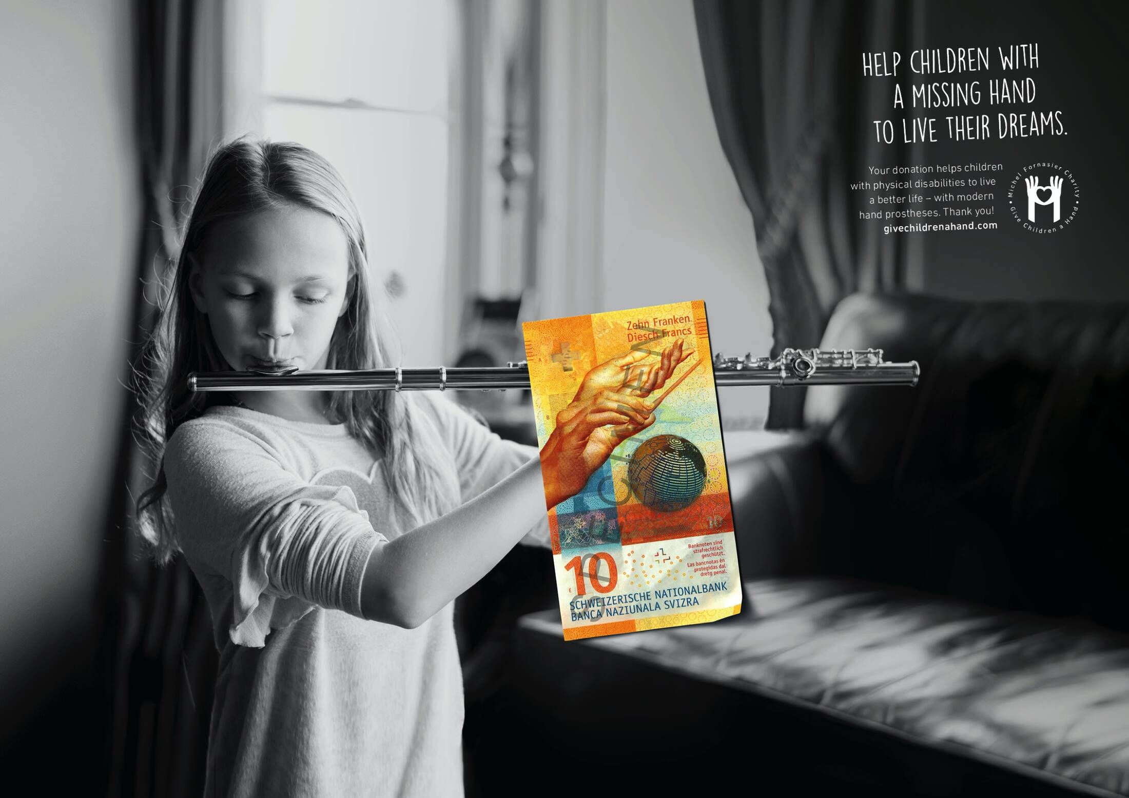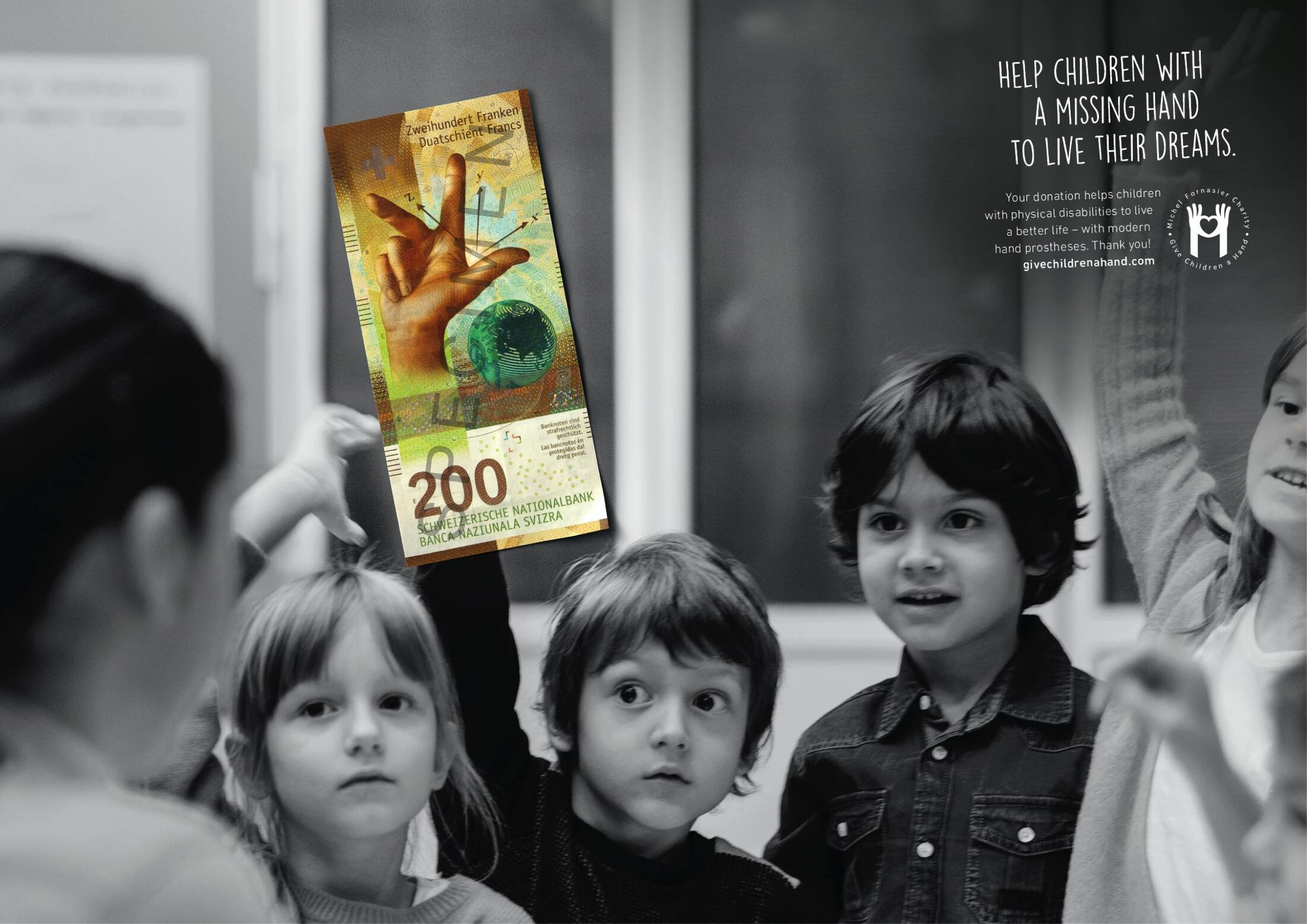 This professional campaign titled 'New Swiss banknotes help children with a missing hand' was published in Switzerland in December, 2019. It was created for the brand: Give Children a Hand, by ad agency: Ruf Lanz. This Print medium campaign is related to the Public Interest industry and contains 6 media assets. It was submitted about 6 years ago by Account Executive: Miro Poffa of Ruf Lanz, Zurich.