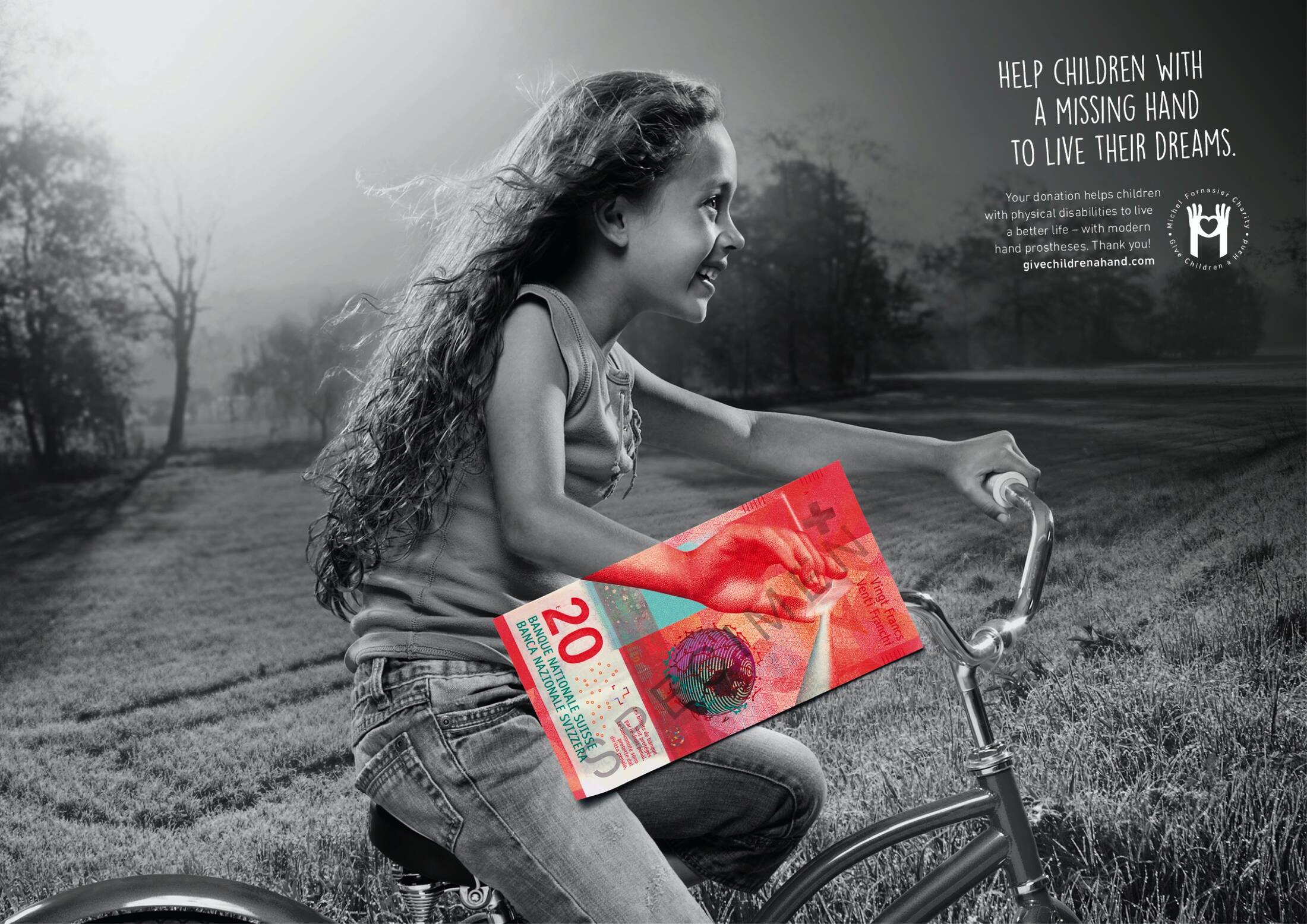 "Give Children a Hand" is a Swiss charity that gives children with physical disabilities access to modern hand prostheses. In order to help as many affected children as possible, the charity is dependent on financial support. Therefore a touching donation campaign should be created. Solution & Cultural Context: A new banknote series was introduced in Switzerland in 2019 - for the first time in 20 years. In the country of the banks, the launch of a new banknote series always gains a lot of attention. This time in particular: for the first time in its history, Swiss banknotes no longer portray famous personalities. Instead, the defining visual feature is the human hand. We made creative use of this for the campaign. The donors' money becomes the children's new hand. And it enables them to do all the things they wouldn't otherwise be able to do: ride a bicycle, confidently stretch out their hand at school, etc. A separate motif was developed for each monetary value. So we had the chance to address small donors as well as major donors.
