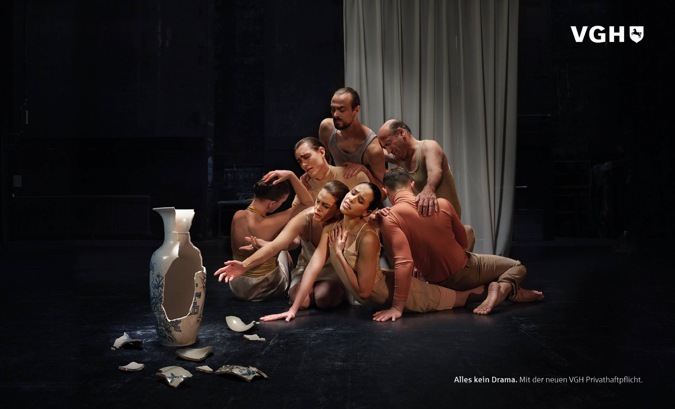 The new campaign for VGH liability insurance. “No drama at all”, promises the VGH and brings the message with a wink entertaining on a real stage. For this, real stage actors were casted, staged and contrasted in classically exaggerated drama poses with a contemporary damage. The shooting took place appropriately on a big theater stage in Hanover.