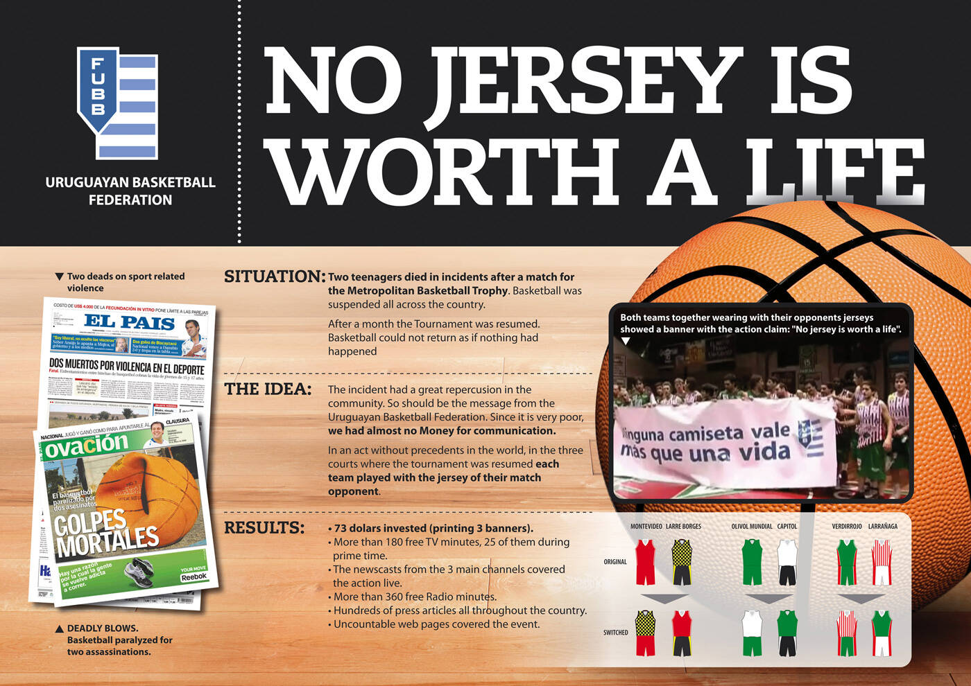 This professional campaign titled 'No jersey (Ninguna camiseta)' was published in Uruguay in June, 2009. It was created for the brand: Uruguayan Basketball Federation, by ad agency: Notable. This Ambient medium campaign is related to the Recreation, Leisure industry and contains 1 media asset. It was submitted over 15 years ago.