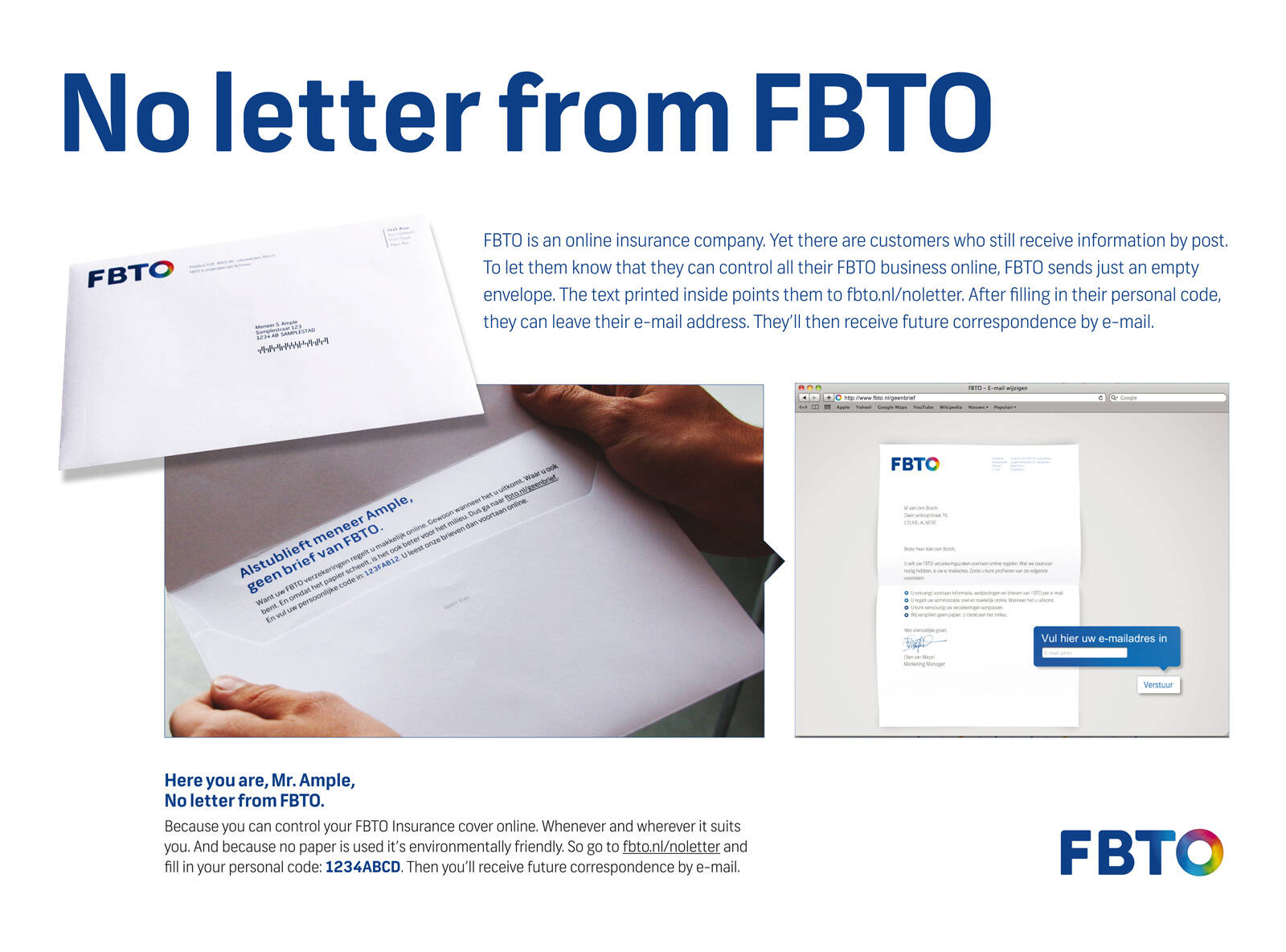 FBTO is an online insurance company. Yet there are customers who still receive information by post. To let them know that they can control all their FBTO business online, FBTO sends just an empty envelope. The text printed inside points them to fbto.nl/noletter. After filling in their personal code, they can leave their e-mail address. They’ll then receive future correspondence by e-mail.