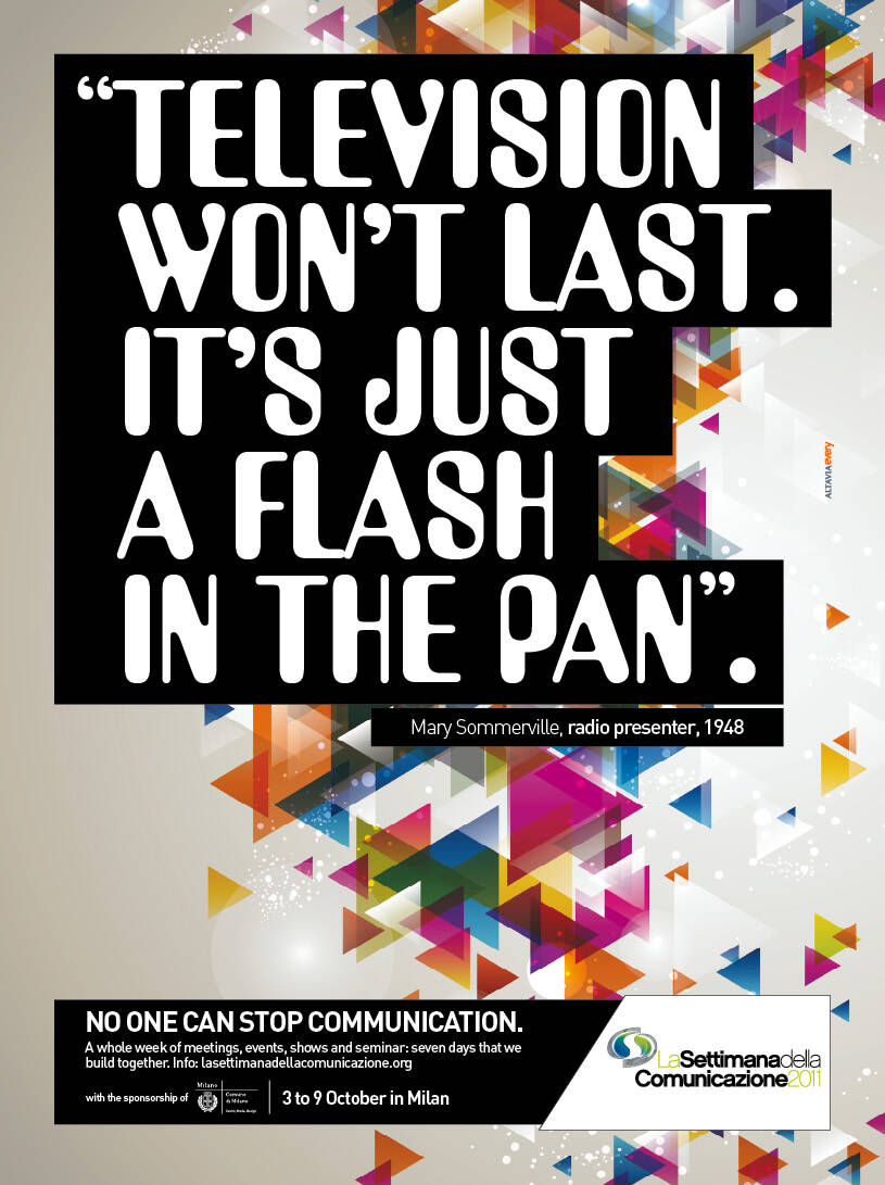 This professional campaign titled 'No one can stop communication' was published in Italy in September, 2011. It was created for the brand: The Week of the Communication, by ad agency: Altavia. This Print medium campaign is related to the Professional Services industry and contains 3 media assets. It was submitted about 14 years ago.