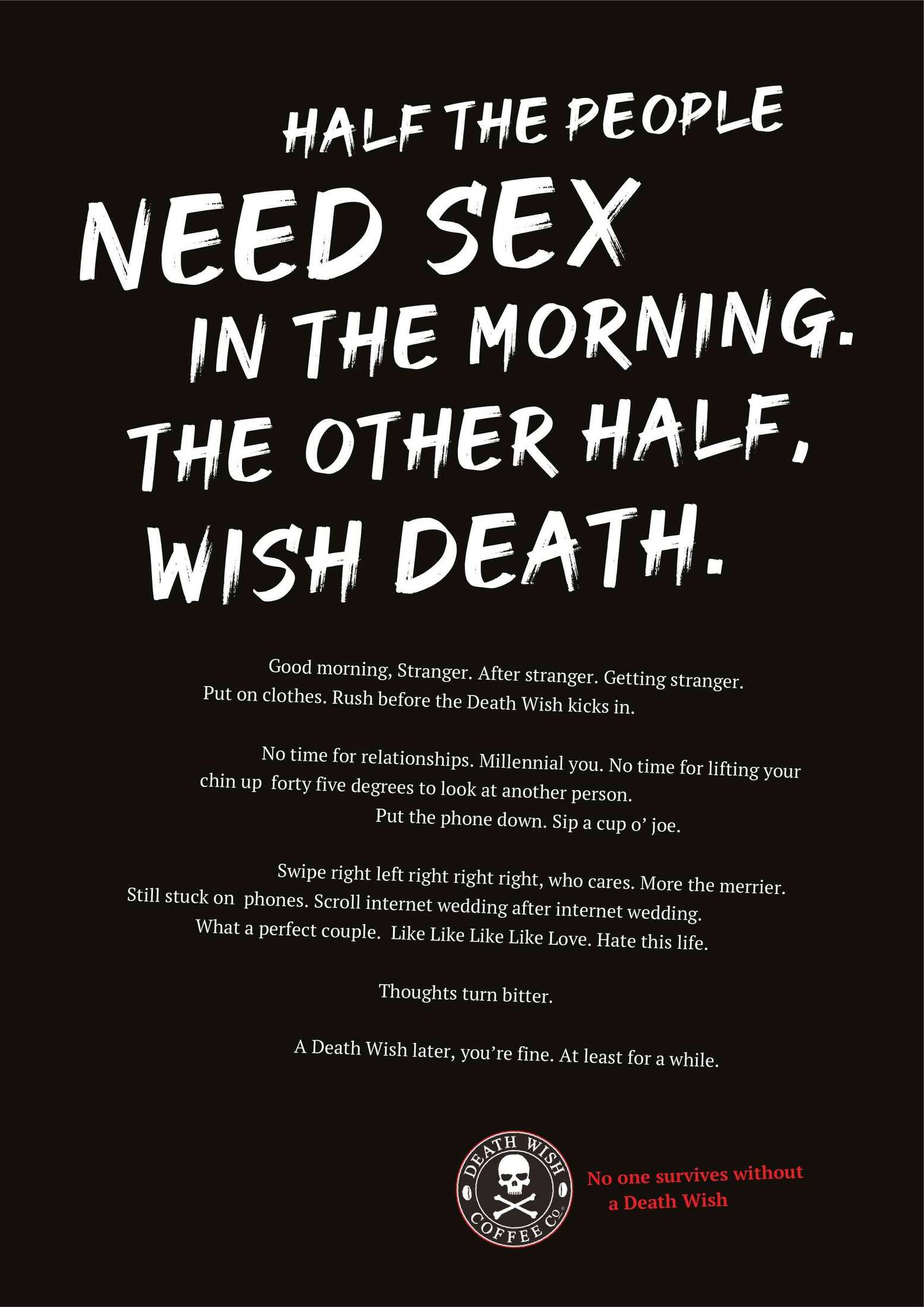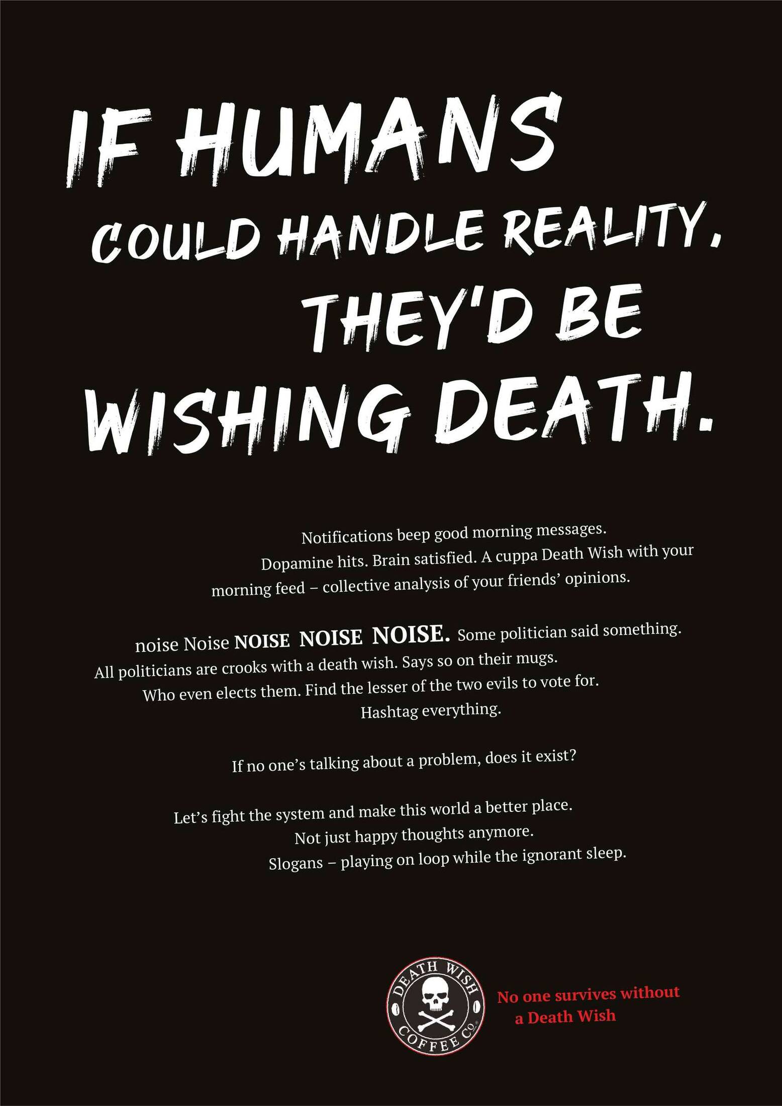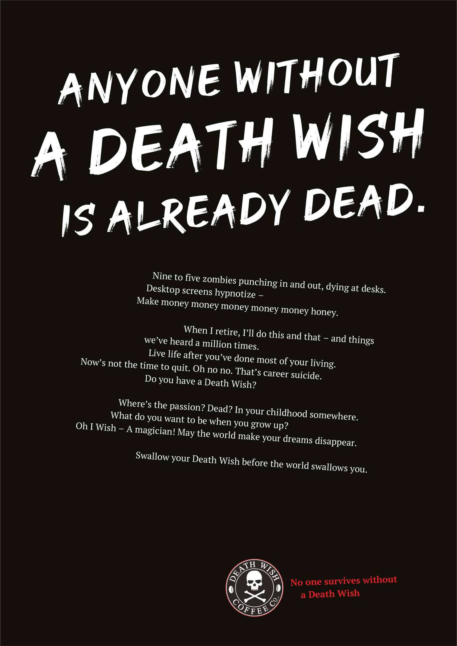 This student campaign titled 'No One survives Without a Death Wish' was published in United States in August, 2019. It was created for the brand: Death Wish Coffee Company, by ad school: The Creative Circus. This Print medium campaign is related to the Drinks (Non Alcoholic) industry and contains 3 media assets. It was submitted over 6 years ago by Student: Priya Narayan.