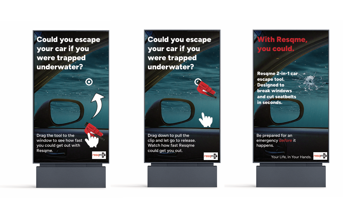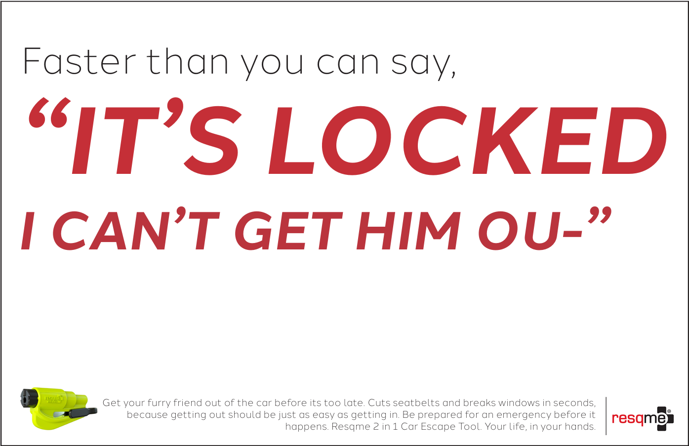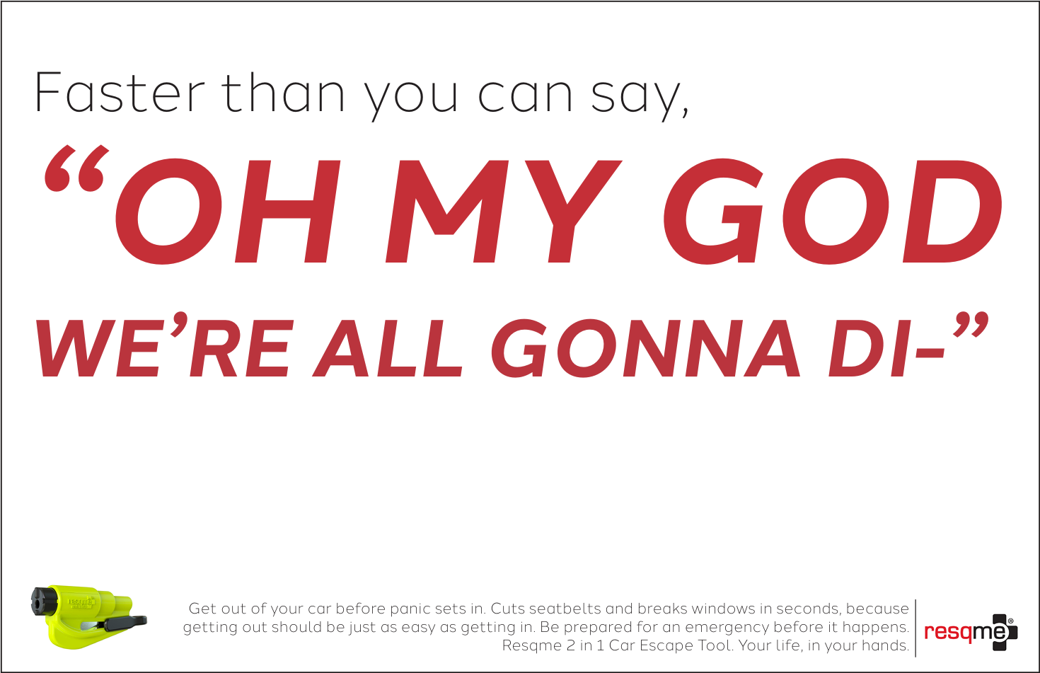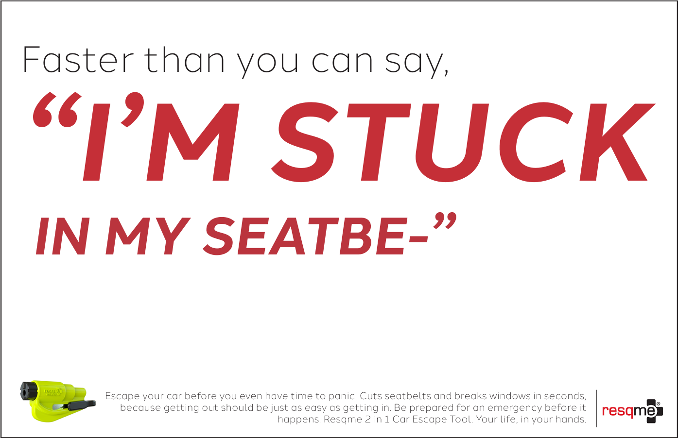 Although the chance of us finding ourselves trapped inside of a vehicle during an emergency is rare, it is not impossible. And when it does, nothing compares to the sheer panic one feels in trying to get out. Fortunately, we can take precautions by being prepared, with Resqme, a tool that breaks windows and cuts seatbelts in seconds. It is always better to be safe rather than sorry, and that is exactly what this campaign is trying to promote; used as a call to action for people to reconsider buying this tool to have on hand since you really never know when that emergency could strike. Resqme is small and compact and a worthy purchase for any drivers to feel more secure, and that is exactly what this campaign tries to highlight. Speed, ease, and security.