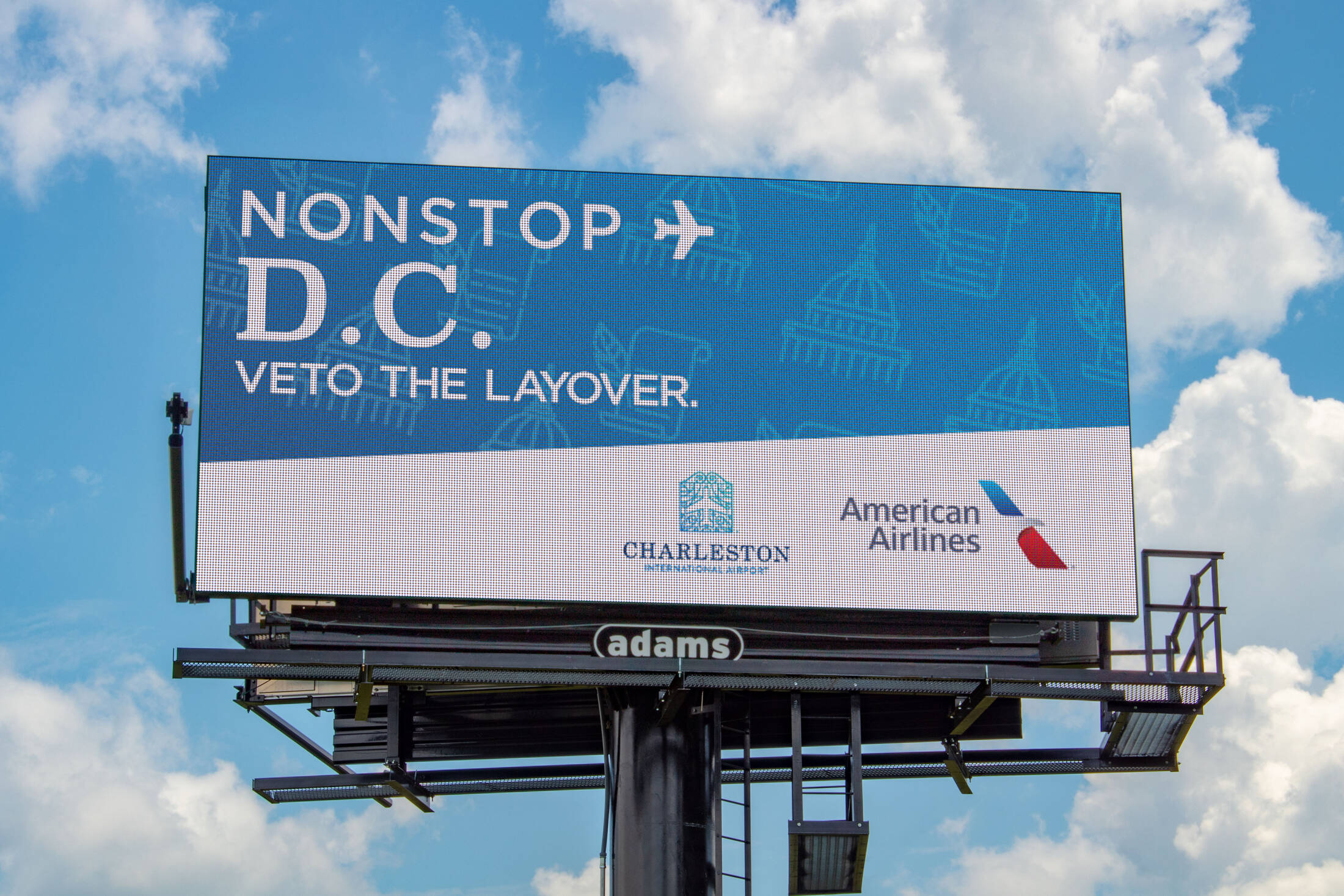 This professional campaign titled 'Nonstop Flights' was published in United States in November, 2022. It was created for the brand: Charleston International Airport, by ad agency: Adams Outdoor. This OOH Outdoor medium campaign is related to the Travel and Tourism industry and contains 5 media assets. It was submitted about 3 years ago.
