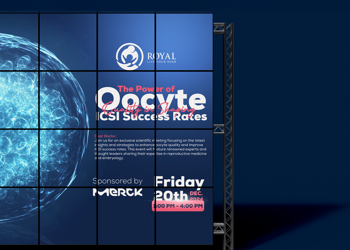Marklinica’s creative approach was driven by a key insight: The design had to match the mindset of the attendees. IVF specialists rely on information that is structured, exact, and reliable. By mirroring this mental model, the visuals allow presenters to communicate complex data without distraction, creating an environment that feels organized and trustworthy.