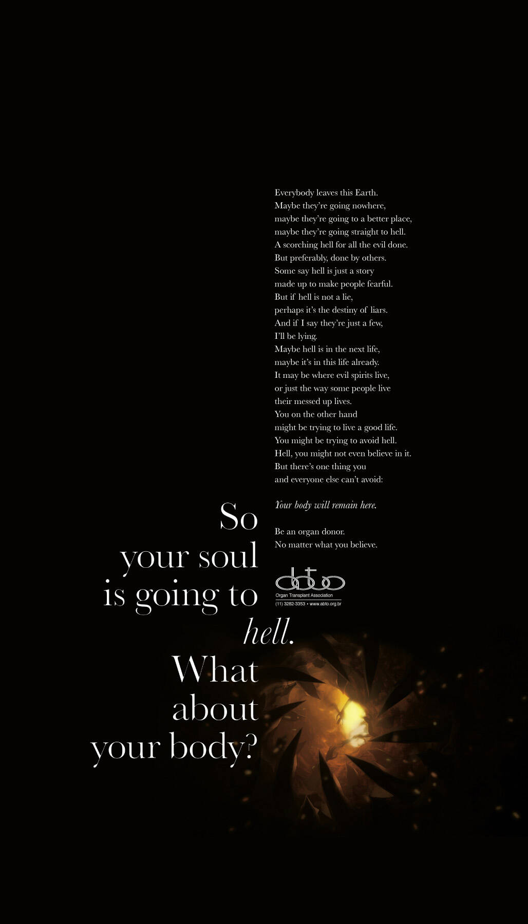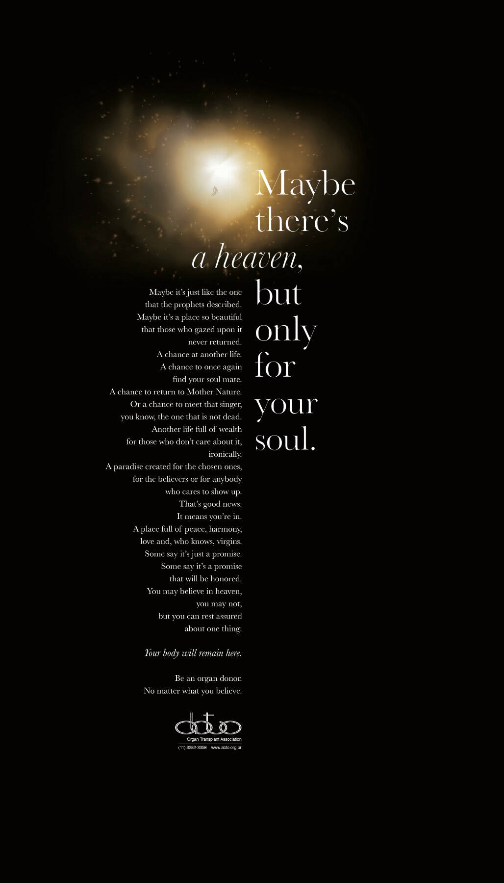 This professional campaign titled 'Nowhere, Heaven, Hell, Soul' was published in Brazil in May, 2012. It was created for the brand: ABTO, by ad agency: DDB. This Print medium campaign is related to the Public Interest industry and contains 4 media assets. It was submitted over 13 years ago.