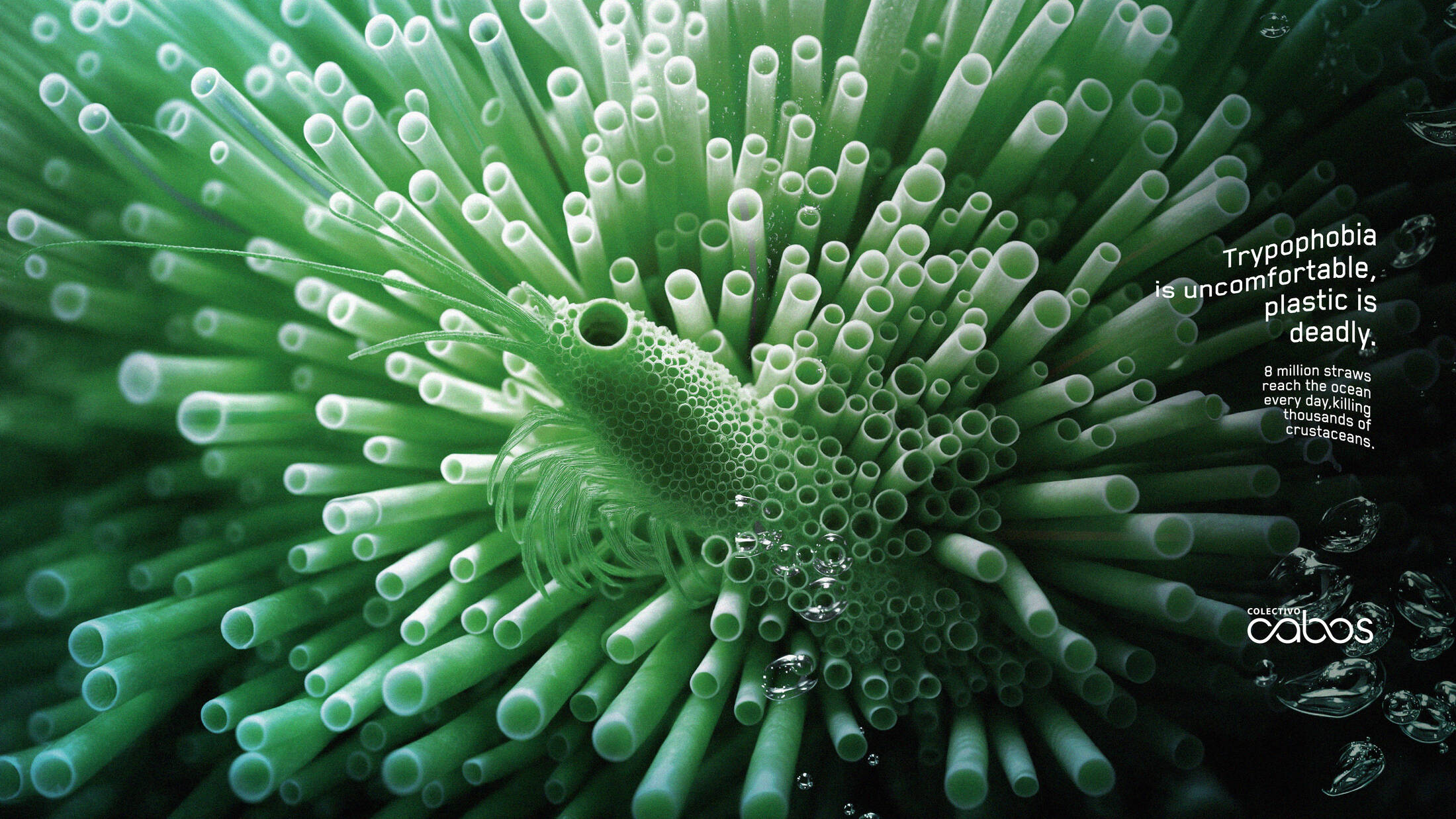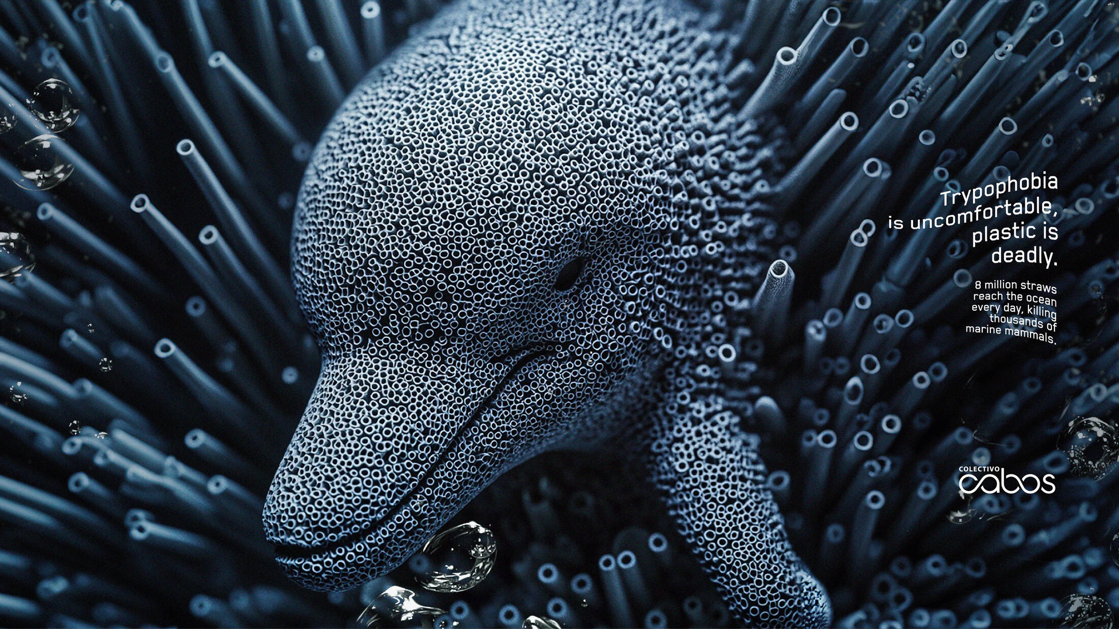 The "Oceans with trypophobia" campaign by Colectivo Los Cabos uses images of patterns made from plastic straws that evoke trypophobia—a reaction that triggers discomfort or disgust in 15% of the population—to create a powerful visual and emotional impact. The goal is for those who feel repulsion when seeing these images to associate it with the deadly harm plastic straws inflict on marine life, where millions of them kill thousands of species every day, inspiring reflection and action to reduce straw use.