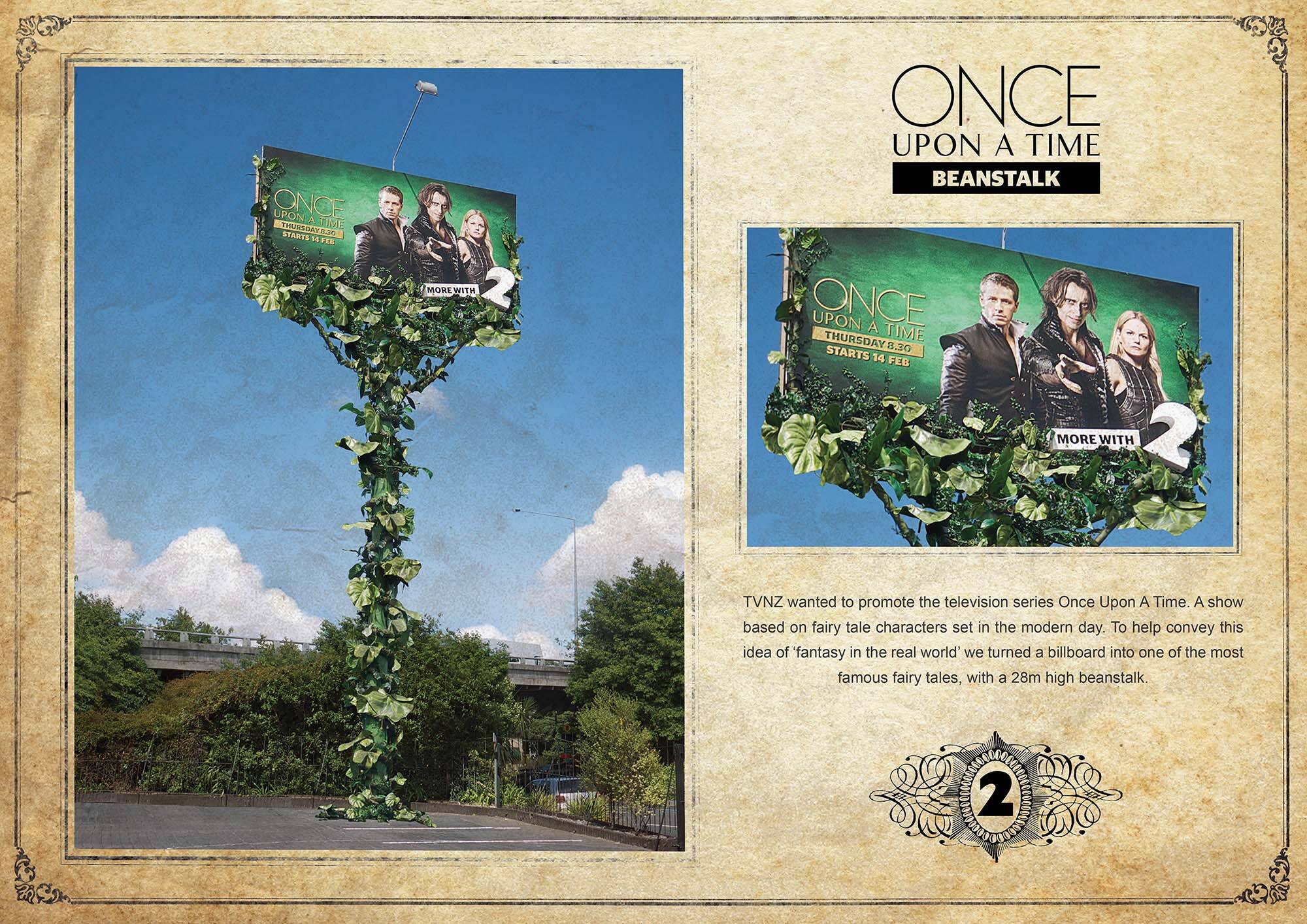 This professional campaign titled 'Once Upon a Time Beanstalk' was published in New Zealand in May, 2013. It was created for the brand: TV2, by ad agency: Contagion. This OOH Outdoor medium campaign is related to the Media industry and contains 1 media asset. It was submitted over 12 years ago.
