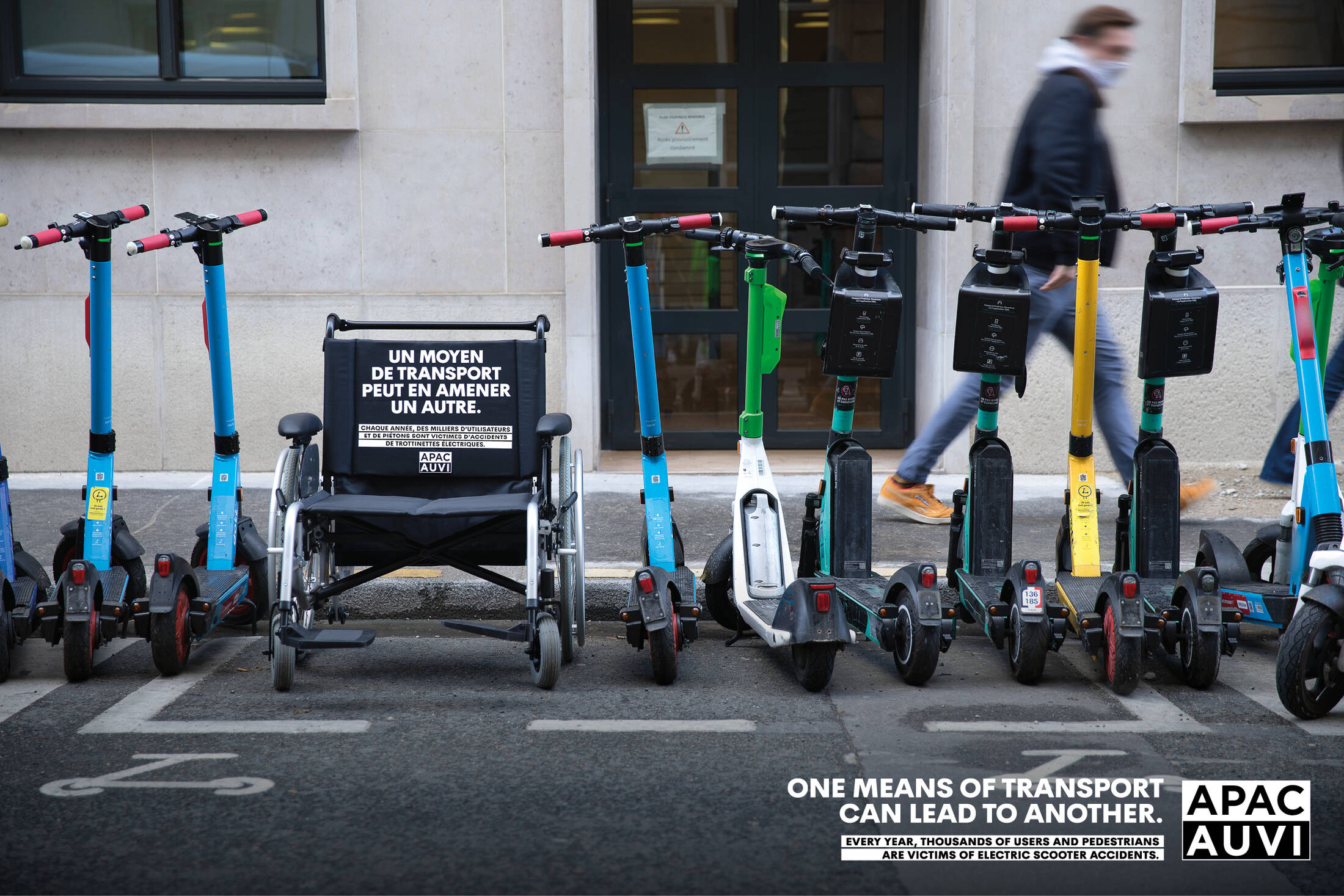Since a few days, wheelchairs on which were written: "One means of transport can lead to another" were placed on various parking areas for electric scooters in the big French cities to raise awareness of the dangers of electric scooters and to decrease the number of incivilities.