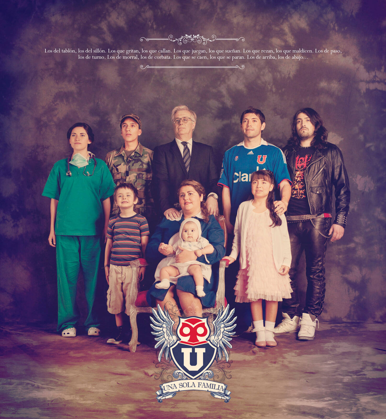 The upper text, is a long list of Chilean last names that –in spanish- mean opposite things. For example “Los Rubio, los Moreno” would be literally translated as “The Blondes, The Brunettes”, and so on. Being one of Chile’s most important football teams, Universidad de Chile’s most relevant attribute (even recognized by rival teams) are indeed it’s fans. Their passion knows no limits, no social differences, no professions. When you love this team, that’s all that matters. You’re part of this family.