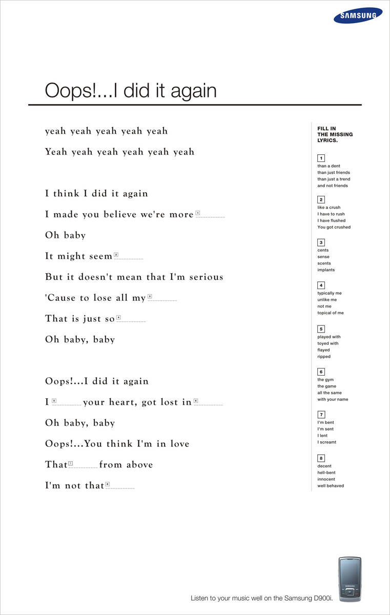 This professional campaign titled 'Oops....I did it again, Hotel California' was published in India in December, 2007. It was created for the brand: Samsung, by ad agency: Cheil. This Print medium campaign is related to the Electronics, Technology industry and contains 2 media assets. It was submitted almost 18 years ago.