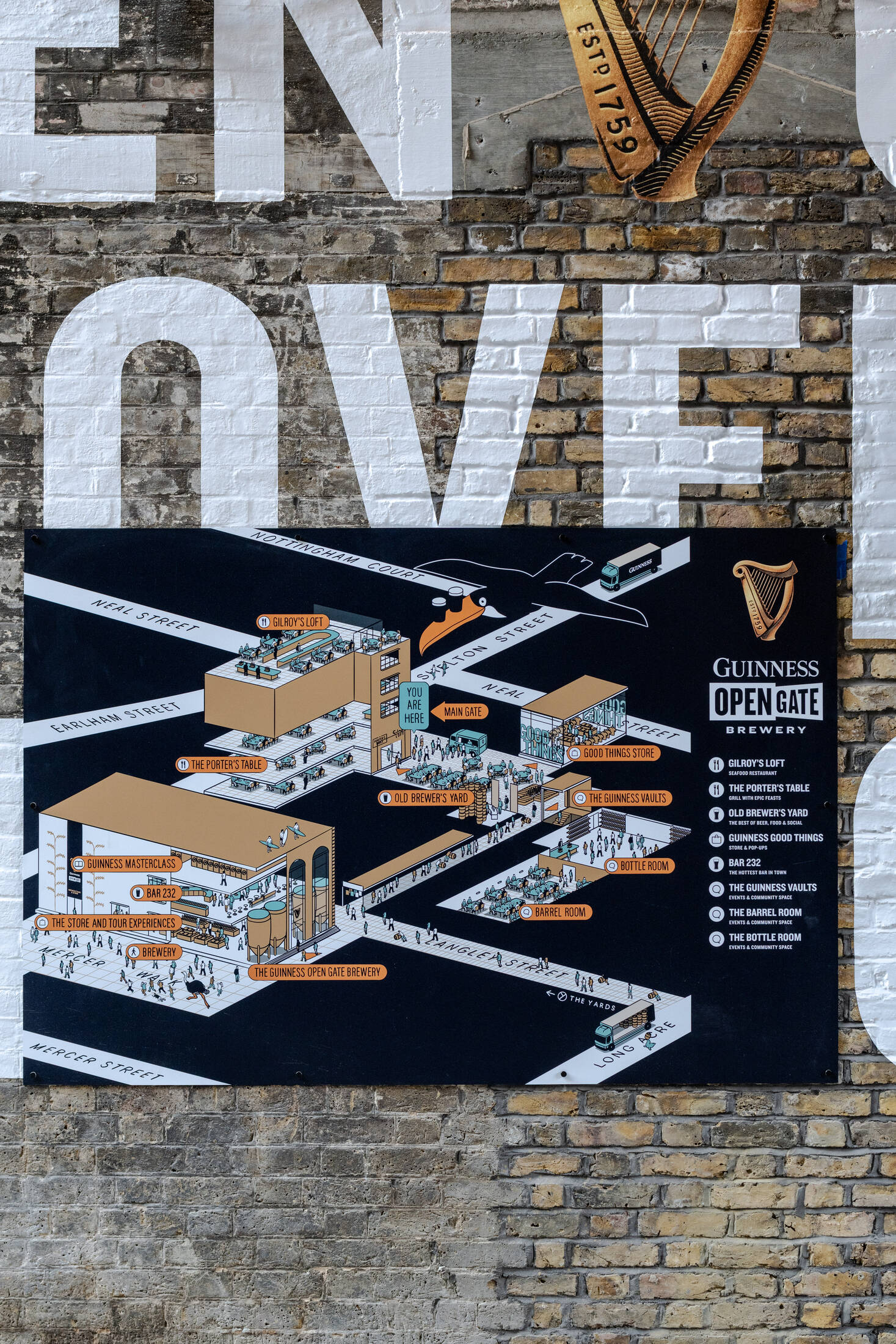 External wayfinding takes inspiration from the iconic visual language of Guinness.