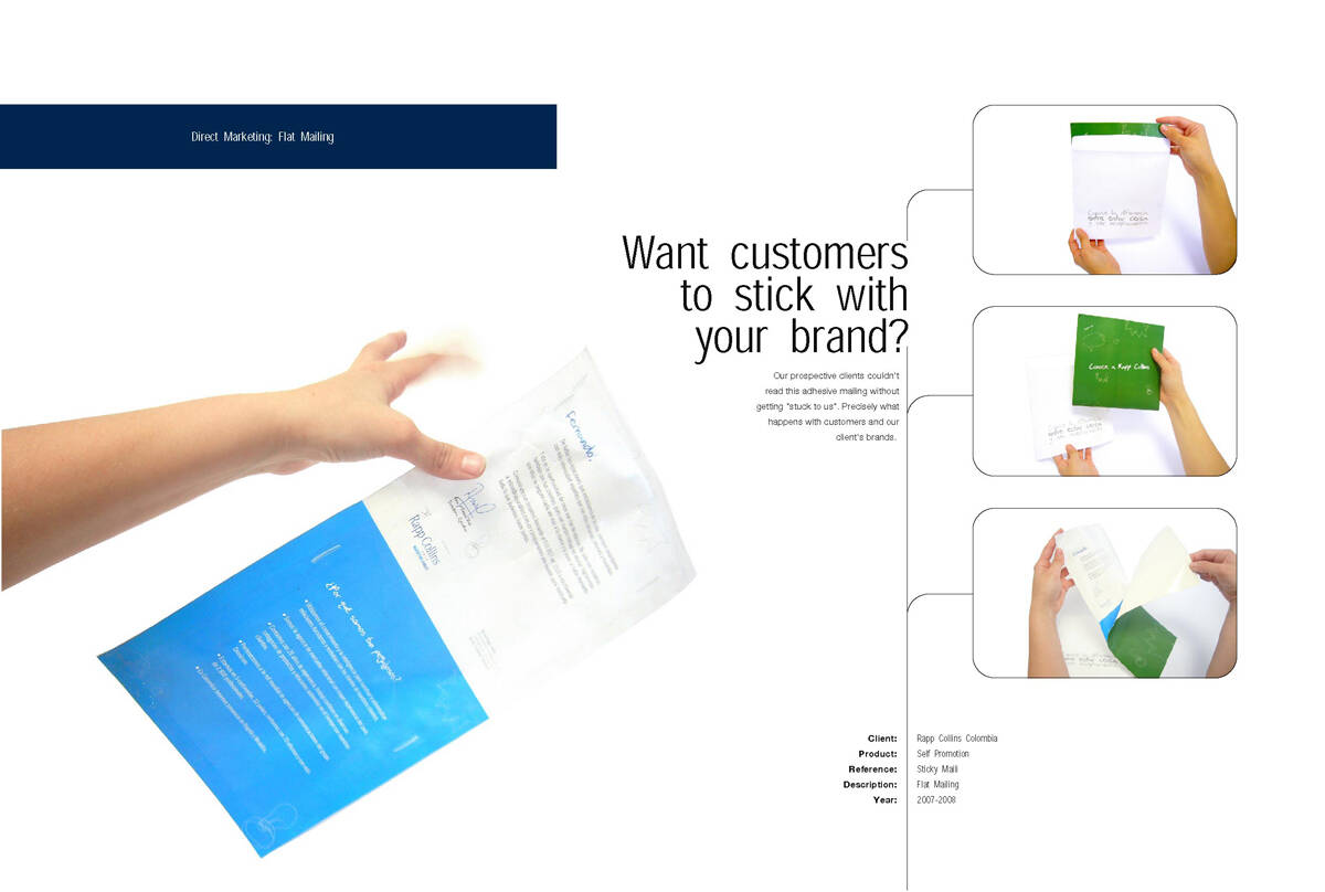 This professional campaign titled 'Our customers stick to us' was published in Colombia in December, 2008. It was created for the brand: Rapp Collins Worldwide, by ad agency: Rapp. This Static Images medium campaign is related to the Agency Self-Promo industry and contains 1 media asset. It was submitted over 17 years ago.