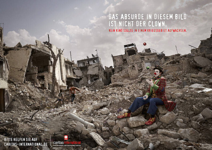 Pictures of war and terror seem common place these days, we scan them with no emotion or feeling, this campaign was created to make you take a second look, and see the really upsetting details within the warzones. You think the clown, ice-cream truck or balloon seller are out of place here. We believe it’s the children.