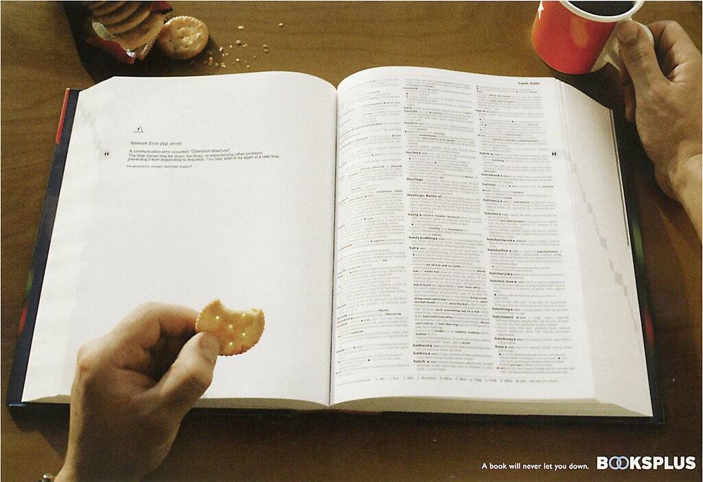 This professional campaign titled 'Page cannot be displayed, Network Error' was published on December 01, 2006. It was created for the brand: Booksplus, . This Print medium campaign is related to the Recreation, Leisure industry and contains 2 media assets. It was submitted almost 19 years ago.