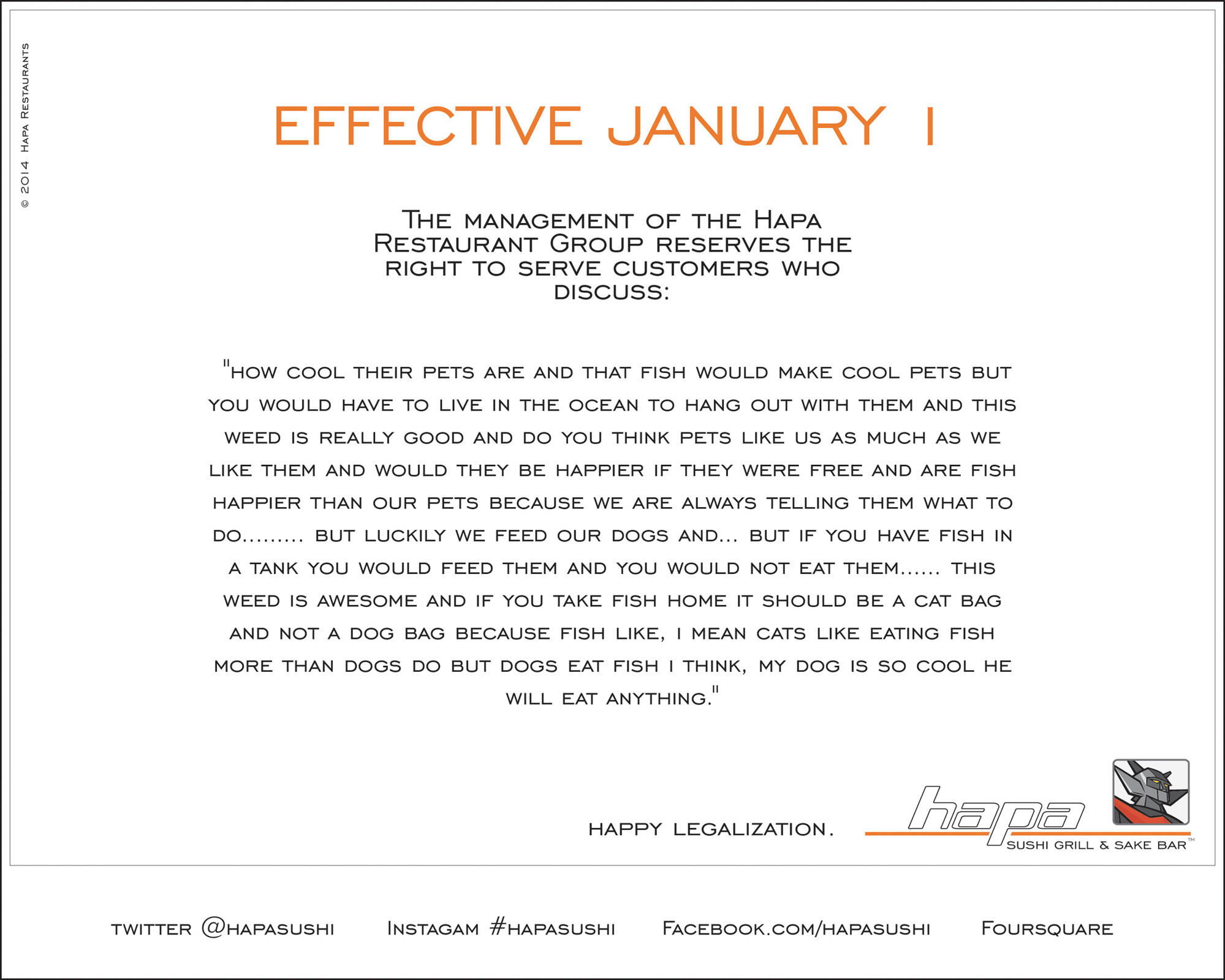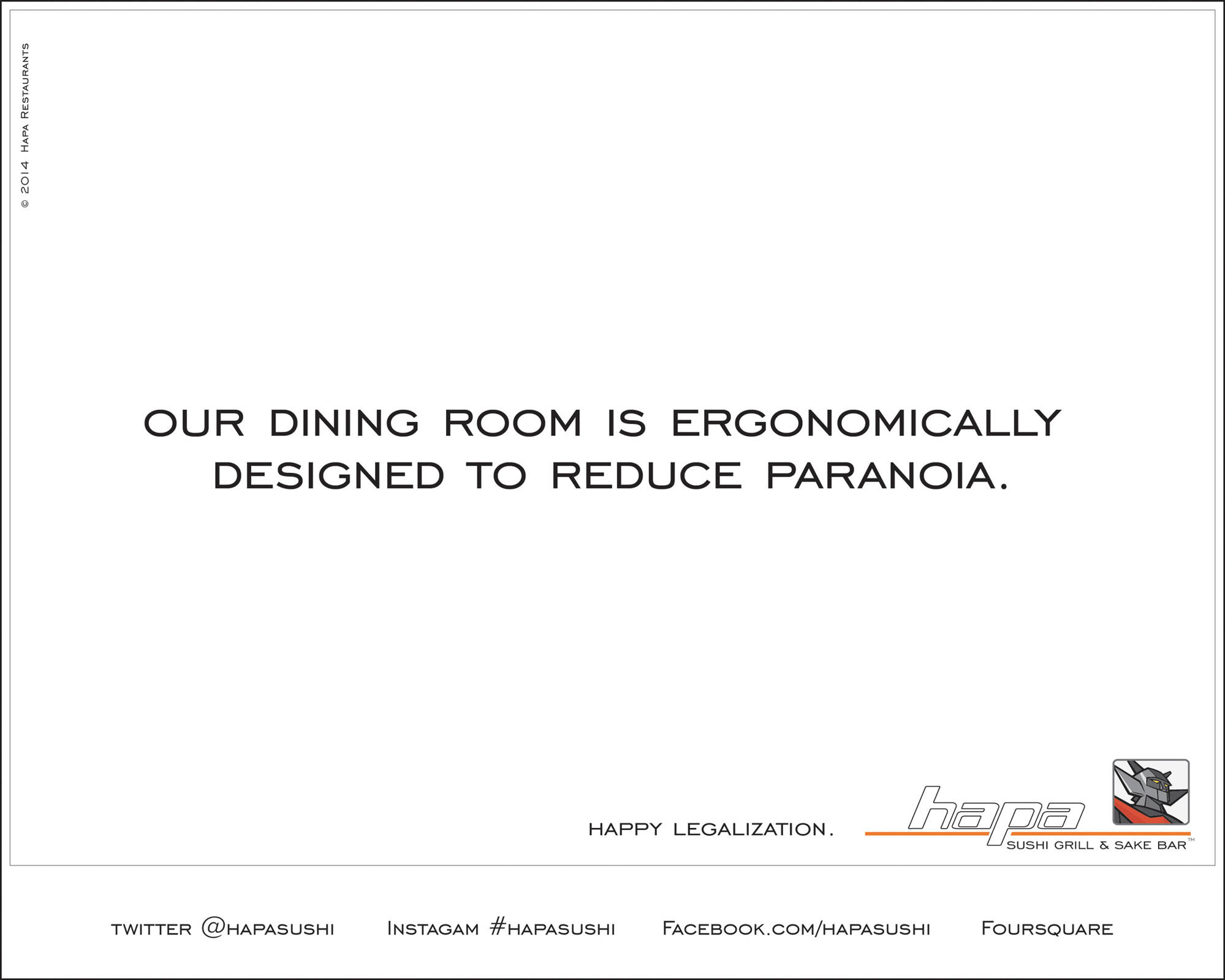 This professional campaign titled 'Pairing Menu, Ergonomically Designed, Effective January 1' was published in United States in January, 2014. It was created for the brand: Hapa Sushi, by ad agency: TDA_Boulder. This Static Images medium campaign is related to the Food industry and contains 3 media assets. It was submitted almost 12 years ago.