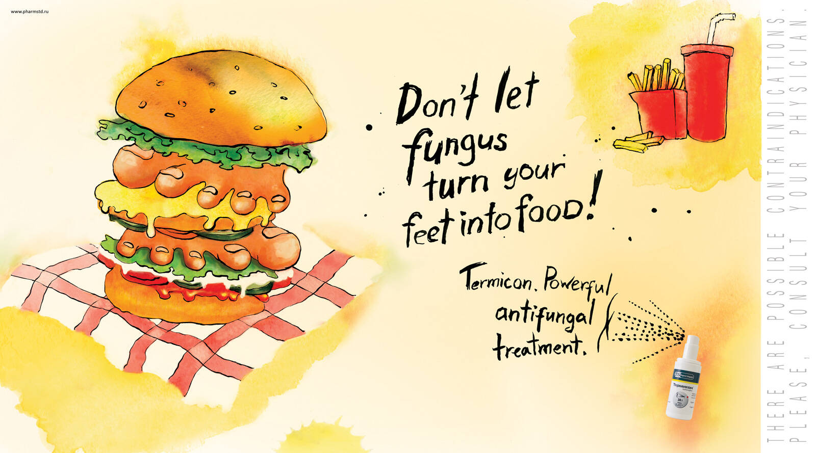 This professional campaign titled 'Pan, Hamburger, Pickles' was published in Russia in March, 2011. It was created for the brand: Termicon, by ad agency: Dentsu. This Print medium campaign is related to the Pharmaceutical industry and contains 3 media assets. It was submitted over 14 years ago.