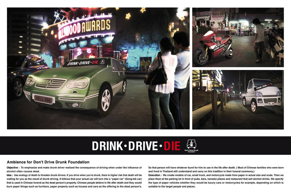 This professional campaign titled 'Paper cars' was published in Thailand in May, 2008. It was created for the brand: Don't Drive Drunk Foundation, by ad agency: Dentsu. This Ambient medium campaign is related to the Public Interest industry and contains 1 media asset. It was submitted over 17 years ago.