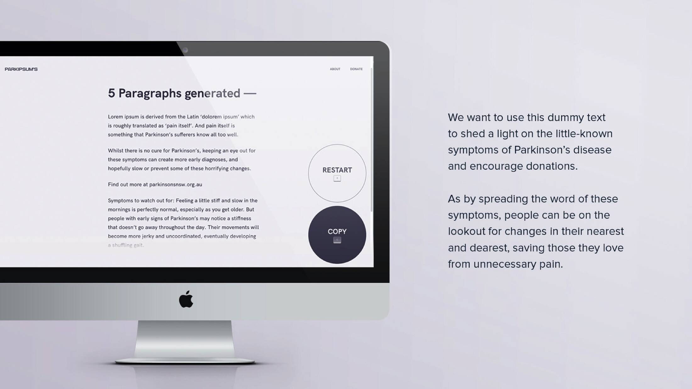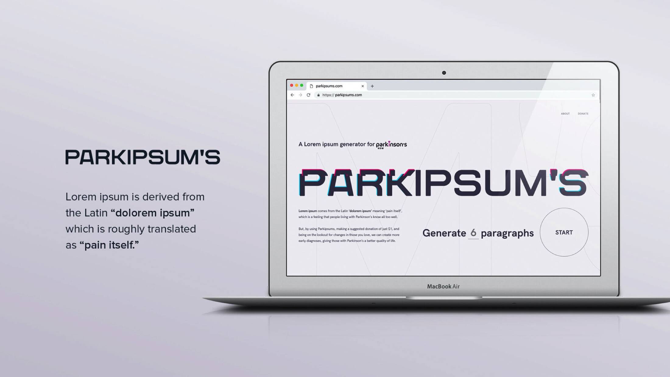 Designers, creatives and web architects; they are just some of the people who see ‘Lorem Ipsum’ daily. Yet many don’t realise it derives from the Latin ‘dolorem ipsum’, roughly translated to ‘pain itself’ . Two words that people living with Parkinsons know all too well. In recognition of Parkinson’s Awareness Month, Wunderman Thompson Australia and Parkinson’s NSW have created Parkipsum’s – a Lorem Ipsum generator. Launched on World Parkinson’s Day, the tool changes the usual Lorem Ipsum dummy text to a variation that sheds light on the little-known symptoms of Parkinson’s, while also raising the importance of being aware of changes within yourself and others to increase early detection.
