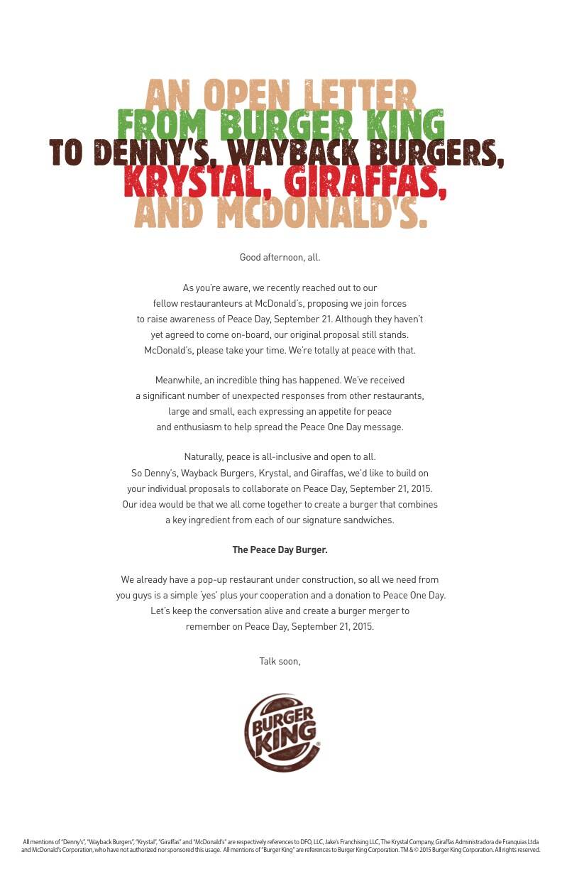 This professional campaign titled 'Peace Day Burger' was published in United States in September, 2015. It was created for the brand: Burger King, . This Print medium campaign is related to the Food industry and contains 1 media asset. It was submitted over 10 years ago.