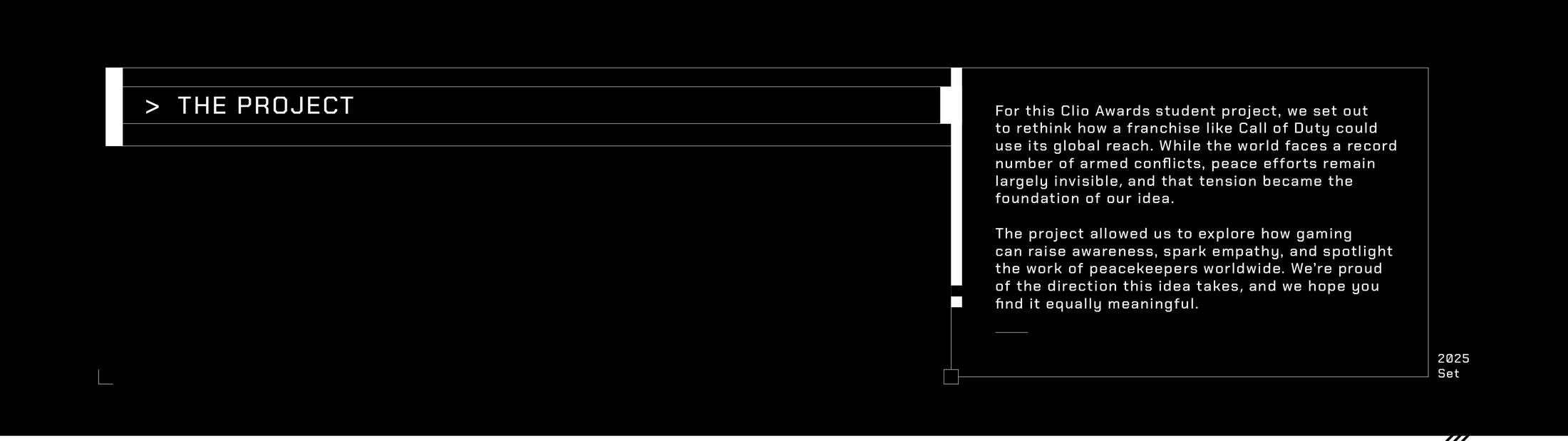 This student campaign titled 'Peace Missions' was published in Uruguay in September, 2025. It was created for the brands: Activision and United Nations, by ad school: Brother Escuela de Creativos. This Content and Digital media campaign is related to the Gaming industry and contains 14 media assets. It was submitted 6 days ago.