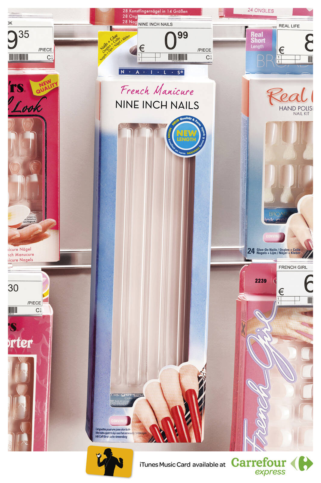 This professional campaign titled 'Pearl Jam, Nine Inch Nails' was published in Belgium in April, 2011. It was created for the brand: Carrefour, by ad agency: Publicis. This Print medium campaign is related to the Retail Services industry and contains 2 media assets. It was submitted over 14 years ago.