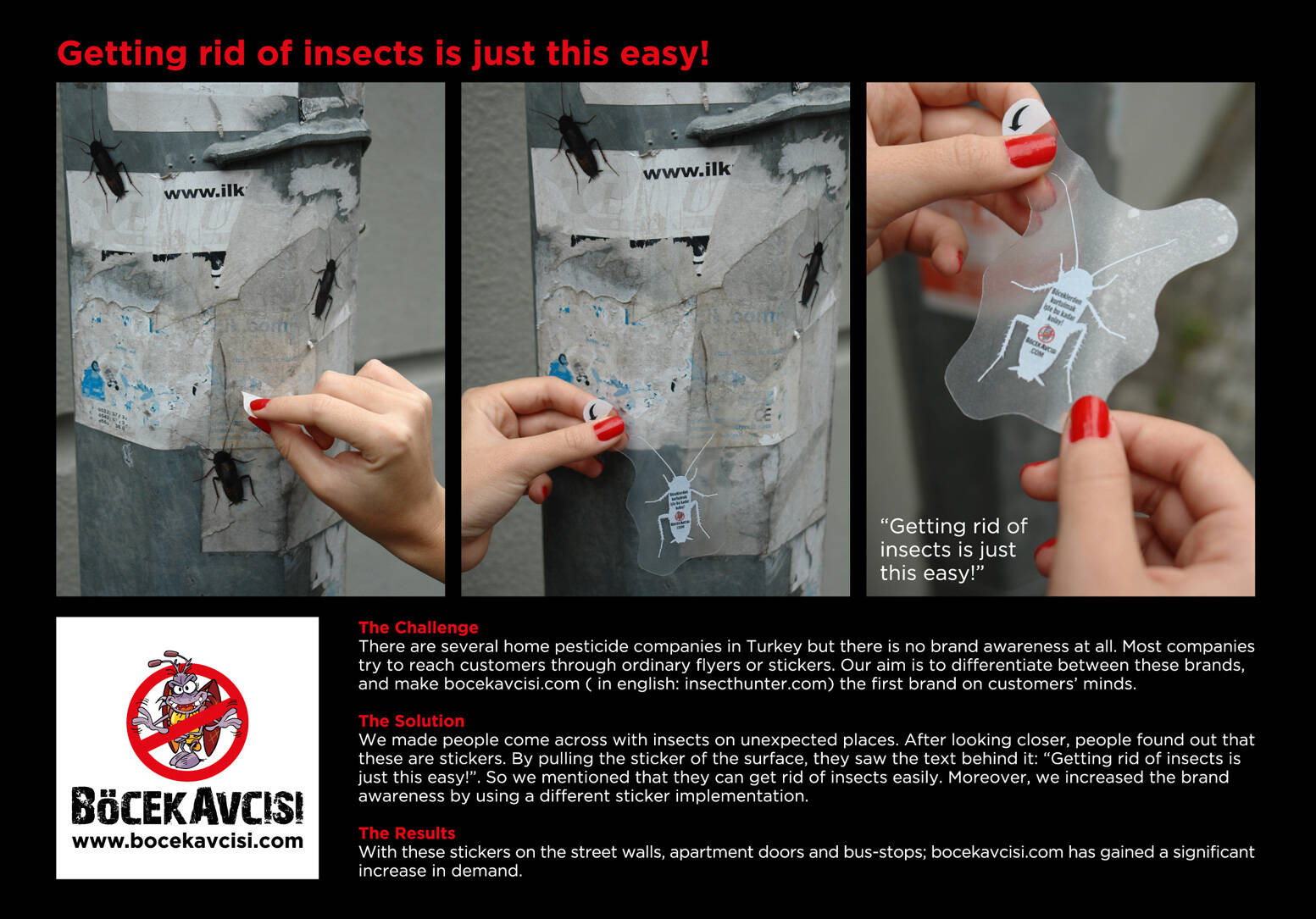 This professional campaign titled 'Peel-off bug' was published in Turkey in October, 2010. It was created for the brand: Böcek Avcisi, by ad agency: McCann. This Ambient medium campaign is related to the Professional Services industry and contains 1 media asset. It was submitted about 15 years ago.