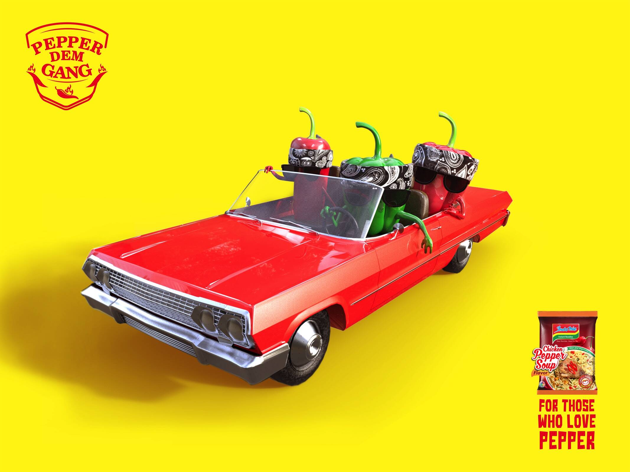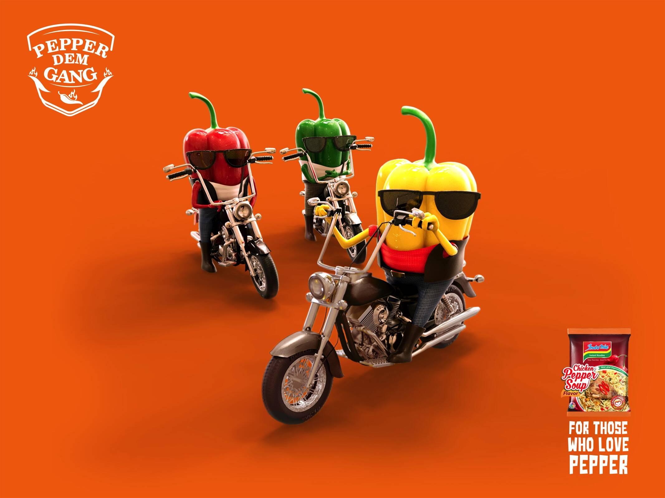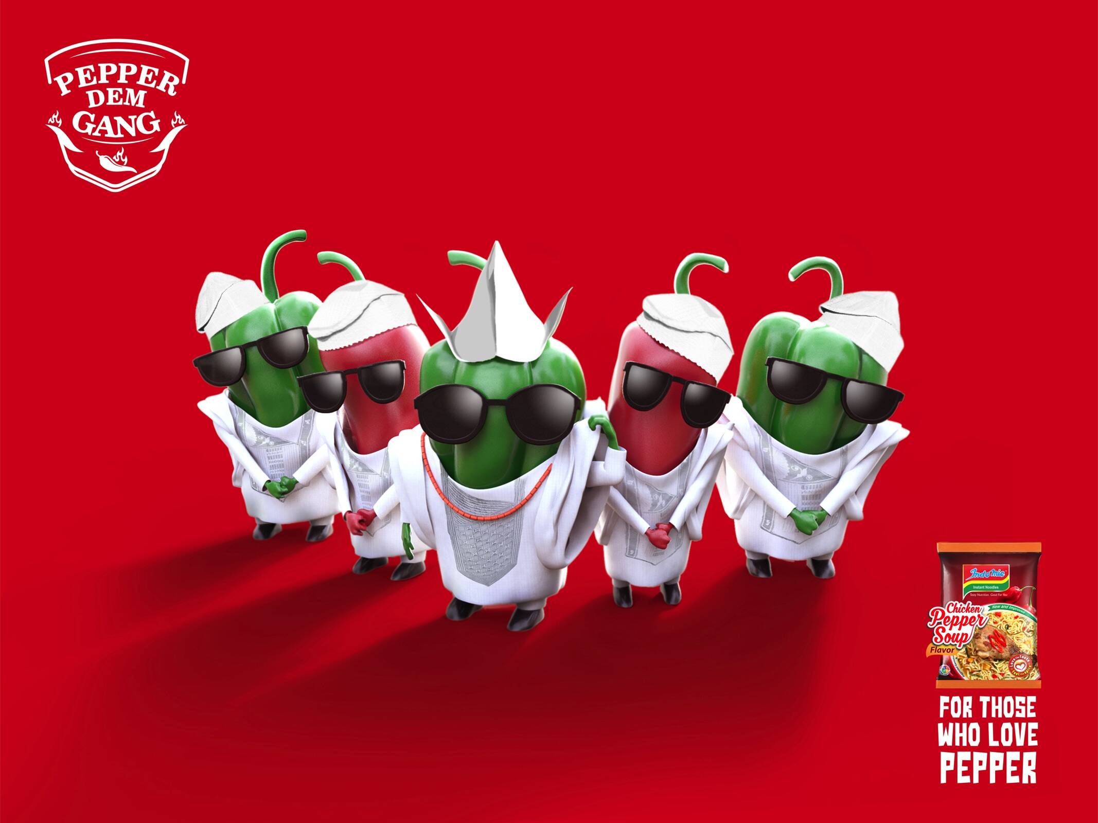 These print series is for Indomie Instant Noodles "Chicken Peppersoup Flavour". The love for pepper transcends different cultures. These series captures this love for pepper, as well as the concept of being in groups with similar interests, aptly captured by the phrase, "Pepper Dem Gang", a popular slang among Nigerian millennial.