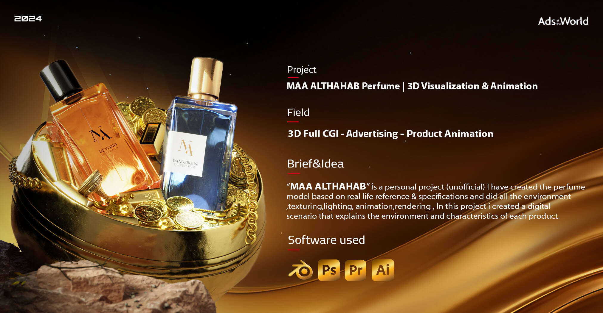“MAA ALTHAHAB” is a personal project (unofficial) I have created the perfume model based on real-life reference & specifications and did all the environment,texturing, lighting, animation,rendering, In this project i created a digital