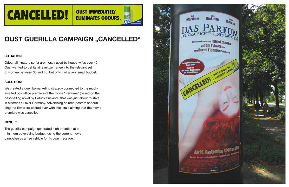 Advertising column posters announcing the film Perfume were pasted over with guerrilla stickers claiming that the movie premiere was canceled.