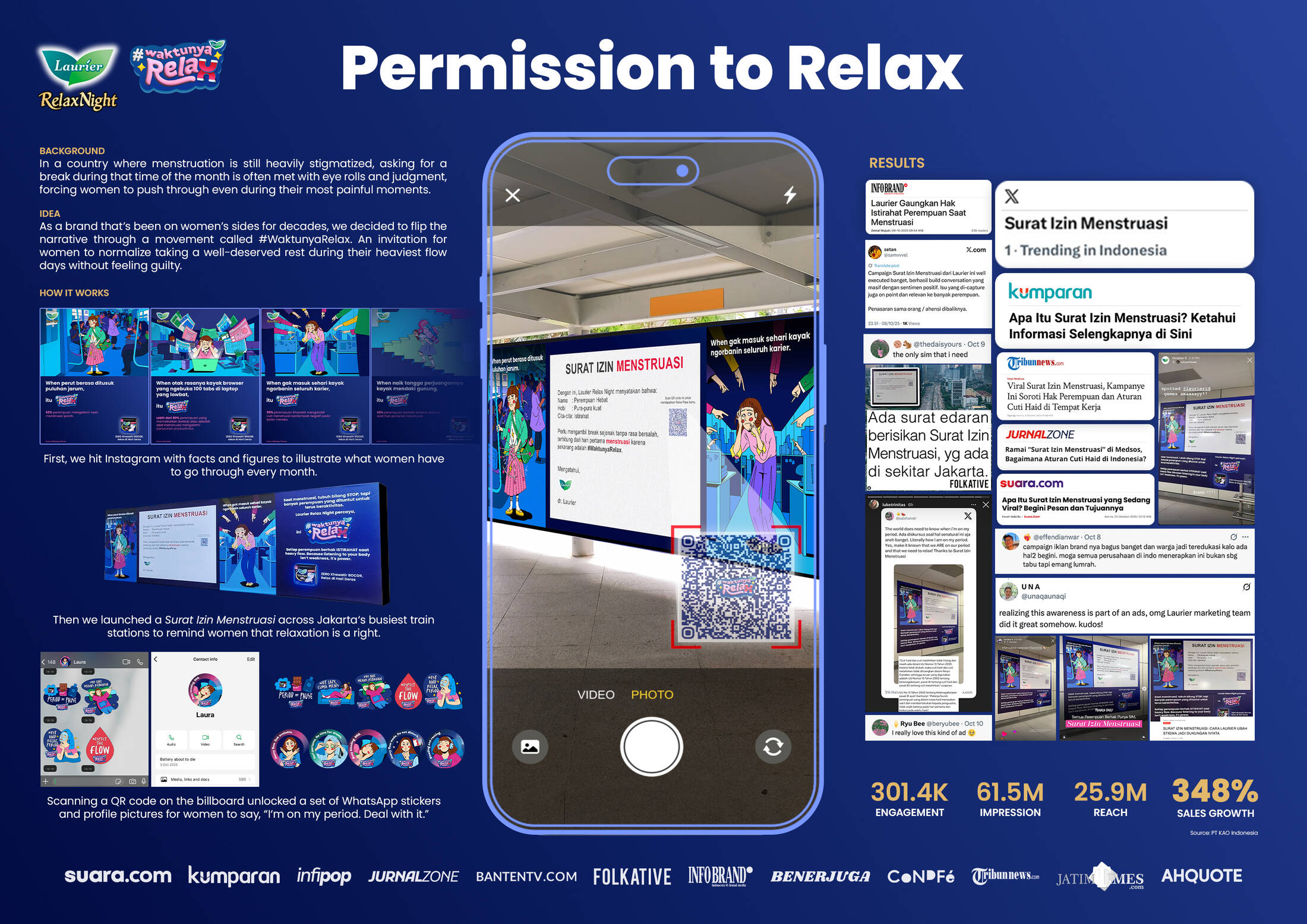 Feminine hygiene brand Laurier launch “Surat izin menstruasi” (Menstruation leave note), a campaign designed to normalise taking time off during heavy-flow days and to dismantle stigma around menstrual pain in Indonesia.